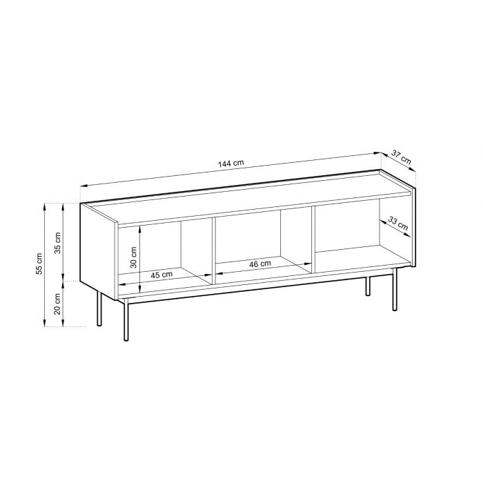 Tv-tasossa on kolme kaappia, joiden ovissa on pehmeästi sulkeutuva soft-close -mekanismi, mikä lisää arjen mukavuutta ja tekee käytöstä miellyttävän äänetöntä. Leveydeltään 144 cm, syvyydeltään 37 cm ja korkeudeltaan 55 cm oleva taso tarjoaa hyvin tilaa mediatarvikkeille, ja kokonaisuuden kantavuus 20 kg sopii monenlaisille televisioille.