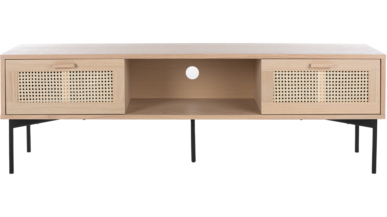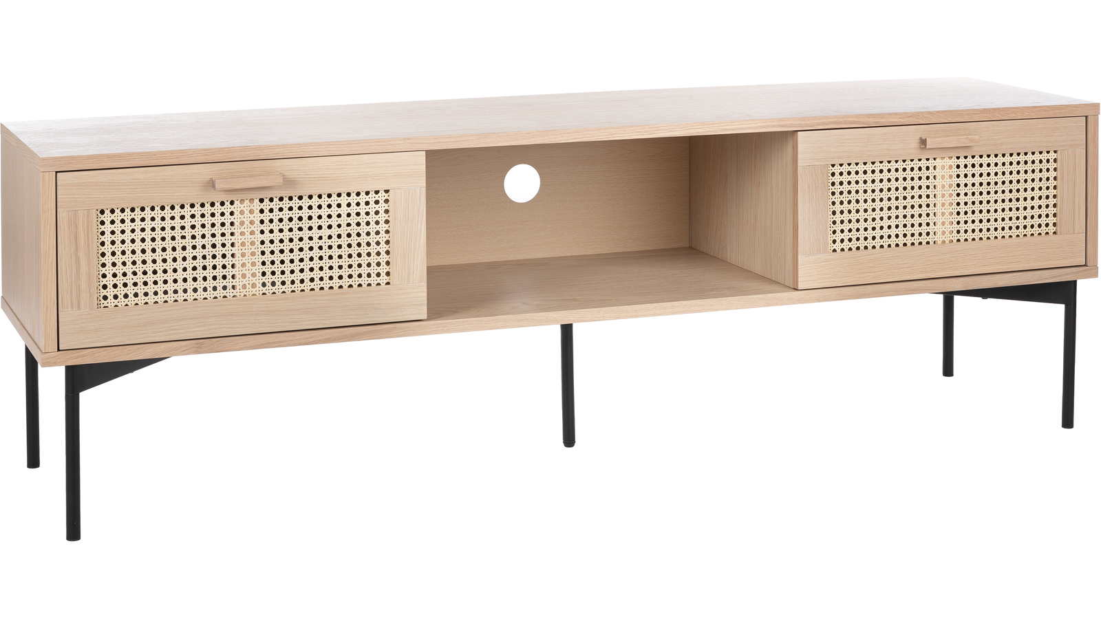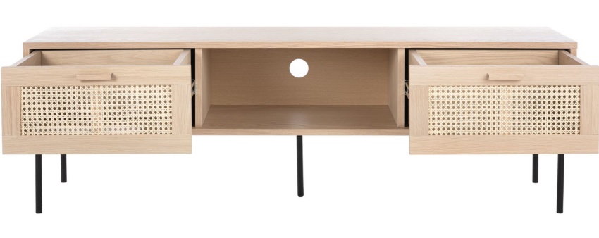 Raffels TV-taso yhdistää modernin muotoilun ja kestävän rakenteen, tarjoten runsaasti säilytystilaa avohyllyn ja kahden rottinkipunotun laatikon avulla. Se on käytännöllinen ja tyylikäs lisä olohuoneeseesi.