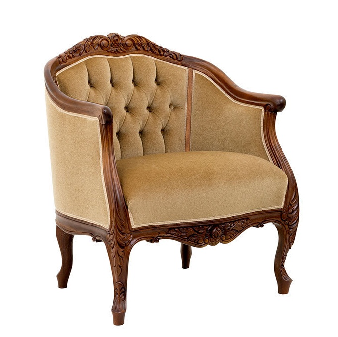 Ranskanrokokoo-nojatuoli on ympäriverhoiltu laadukkaalla mohair-kankaalla, joka yhdistää pehmeyden, kestävyyden ja ylellisen ilmeen. Halutessasi nojatuoli voidaan verhoilla myös muilla kankailla, ja lisäarvokkuutta tuovat käsin maalattavat kulta- tai harmaapatinoinnit.