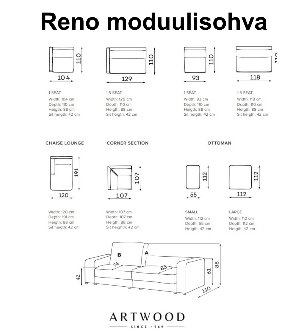 | cm | cm | 88 cm | cm | cm | cm | cm | 42 cm | cm | 54 cm | cm | cm | cm | cm | cm | cm | cm | cm | Irrallinen istuintyyny, Istuimen jousitus (nosag) 4 mm, Verhoilu ei ole irrotettavissa | Irallinen selkänojatyyny, Käännettävä selkätyyny, Silikonikuitu, Verhoilu ei ole irrotettava | cm | cm | cm | cm | cm | cm | cm | cm | cm | cm | Artwood kankaat | Huonekalukangas verhoilu, Jalat metallia, Kylmäpuristettu vaahtomuovi, Runko massiivipuuta, Vaneri, Valinnainen verhoilukangas | Musta | cm | Takuu 2 vuotta | Tilaustuote | Toimitus moduulit omana pakettina | kg | cm | cm | cm |
