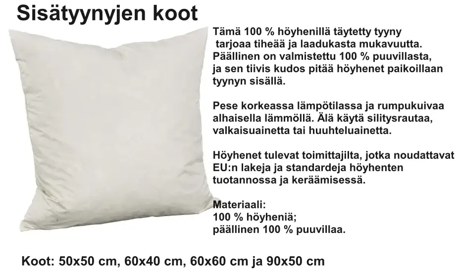 Saatavilla kolme käytännöllistä kokoa — 50×50 cm, 60×40 cm ja 60×60 cm — jotta löydät täydellisen vaihtoehdon eri tyynyihin. Sisätyyny ei sisälly hintaan, mutta voit tilata sen kätevästi lisätarvikkeista.