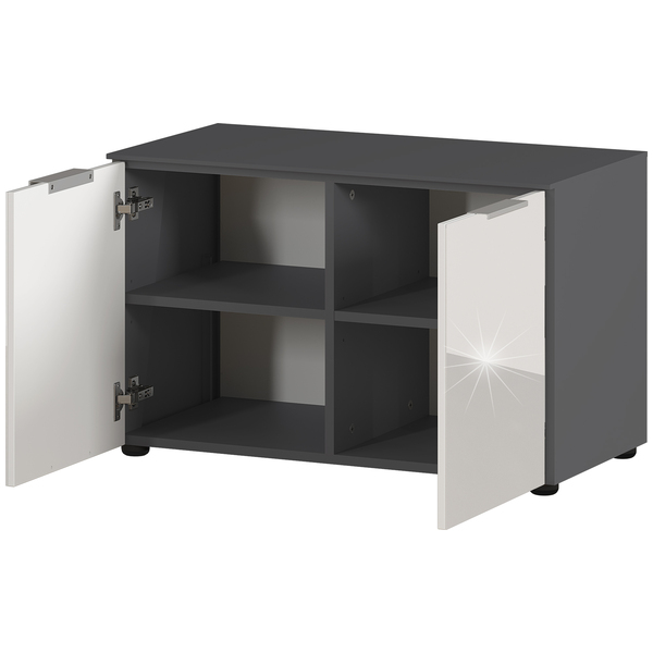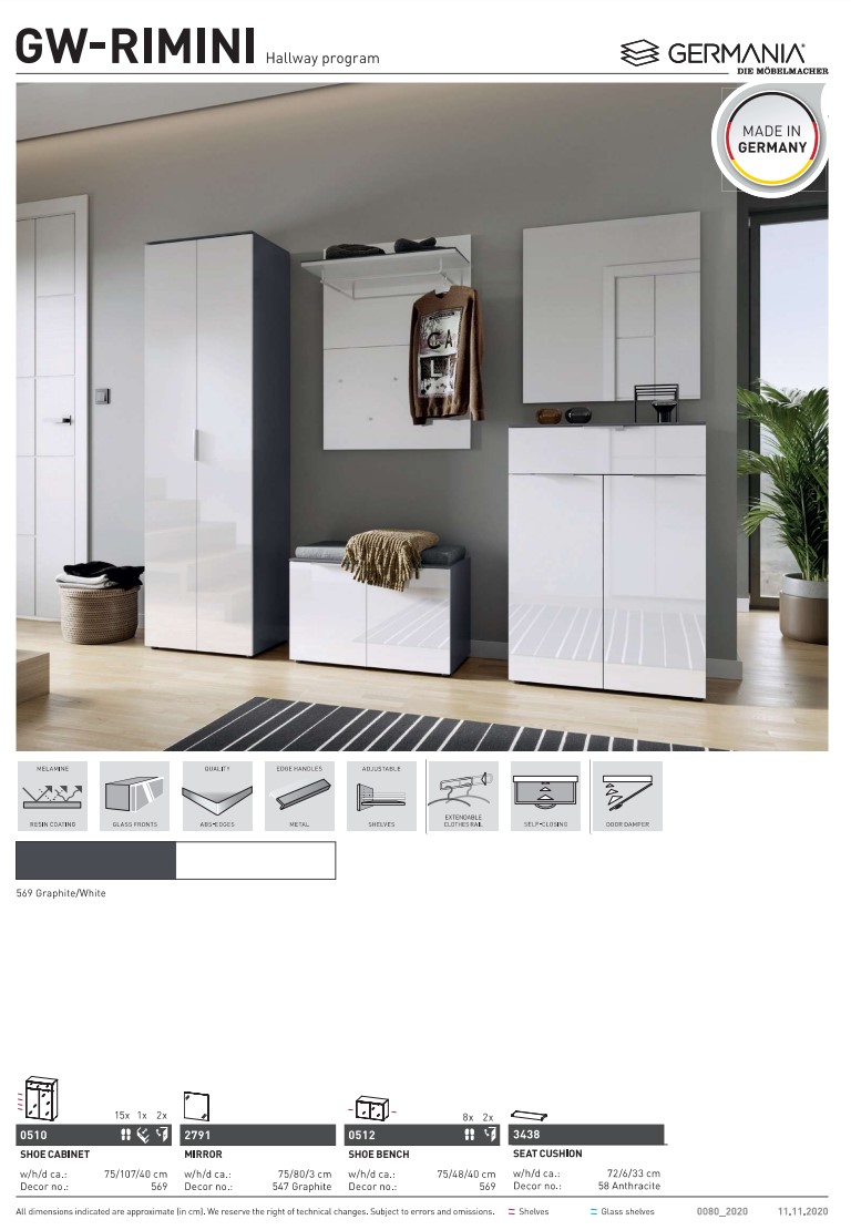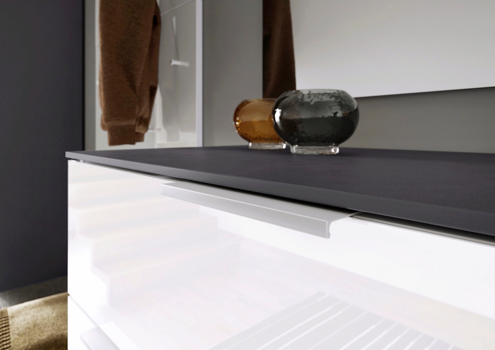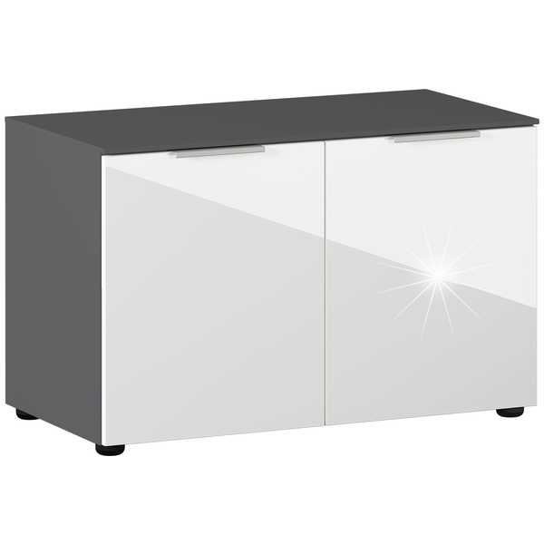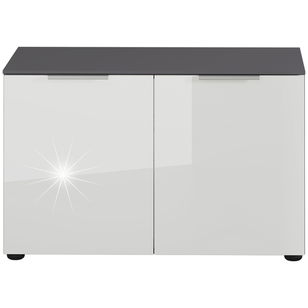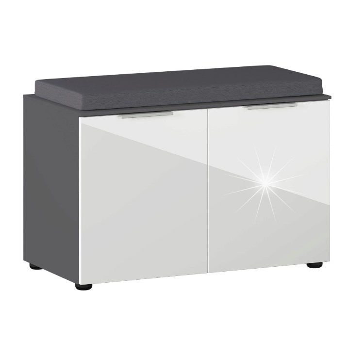 Valkoinen/grafiitti-väriyhdistelmä ja iskunkestävä lasiedusta tuovat kotiisi raikkaan ja modernin ilmeen. Vaimennetut ovet ja korkeussäädettävät hyllyt lisäävät käyttömukavuutta ja tekevät penkistä pitkäikäisen valinnan päivittäiseen käyttöön.