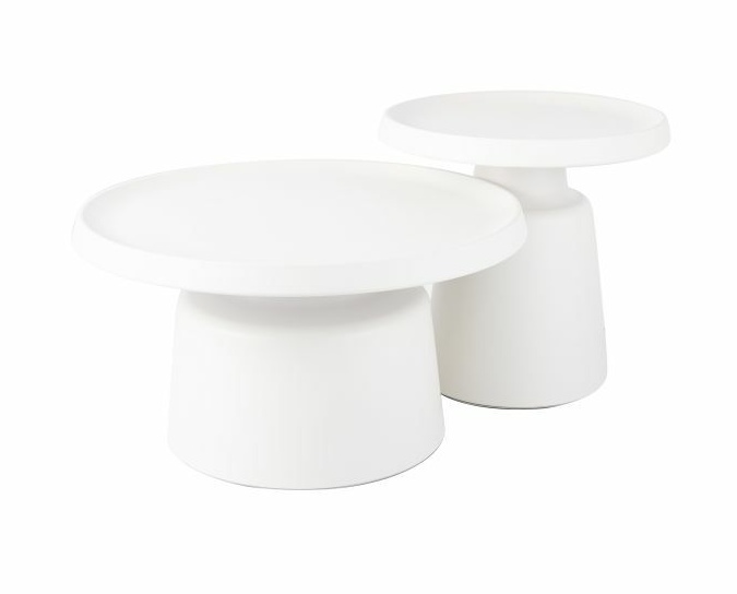 Vaaleanharmaa mattapintainen metallirunko tarjoaa pitkäikäisyyttä, vakautta ja helppohoitoisuutta jokapäiväiseen käyttöön. Isompi pöytä (Ø 70 cm, korkeus 40 cm) ja pienempi pöytä (Ø 50 cm, korkeus 50 cm) täydentävät toisiaan tyylikkääksi ja käytännölliseksi kokonaisuudeksi.