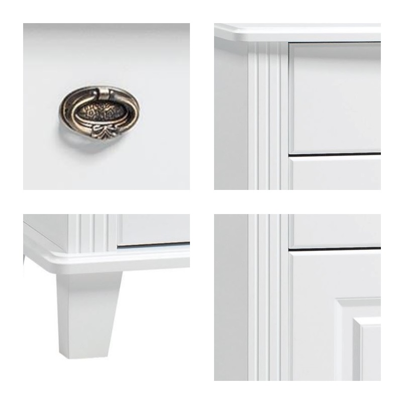 Patinoidun hopean sävyiset vetimet ja upeat koristeviilut rungon reunoissa viimeistelevät senkin ylellisen ulkonäön. Valmistettu Suomessa kestävästä melamiinista ja maalatusta MDF:stä, Rosa senkki 7 on suunniteltu pitkäikäiseksi. Se toimitetaan valmiiksi koottuna – sinun tarvitsee vain kiinnittää vetimet ja jalat paikoilleen, ja senkki on käyttövalmis hetkessä.