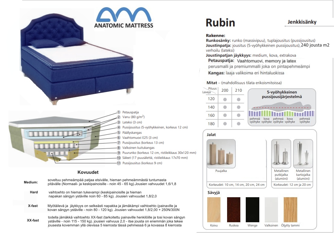 | 180 cm | 210 cm | 48 cm | cm | cm | cm | cm | cm | cm | cm | cm | cm | cm | cm | cm | cm | cm | cm | cm | cm | cm | cm | cm | cm | cm | cm | cm | 180x210 cm | Jenkkisängyn korkeus ilmoitettu ilman jalkoja ja sijauspatjaa | Medium, Kova, Extra kova, Extra Extra kova | cm | Alajousitus pussijousitus korkeus 13 cm, VaahtomuoviHr35, Vanu 80g/m2 | Jousiston yllä ja alla luonnonkumi 3 cm, VaahtomuoviHr35, Vanu 80g/m2, 5 vyöhykkeinen pussijousitus korkeus 12 cm | Ace Kangas, Monolith kangas, Perfect Harmony kangas, Storm kangas | Koivu, Metalli, Musta, Pyökki, Pähkinä, Tammi, Valkoinen | cm | Täystakuu tuotteelle 2 vuotta | Tilaustuote | 70 kg | Viro | cm | cm | cm | Saatavana erikoismittaisena kysy lisää asiakaspalvelusta. |