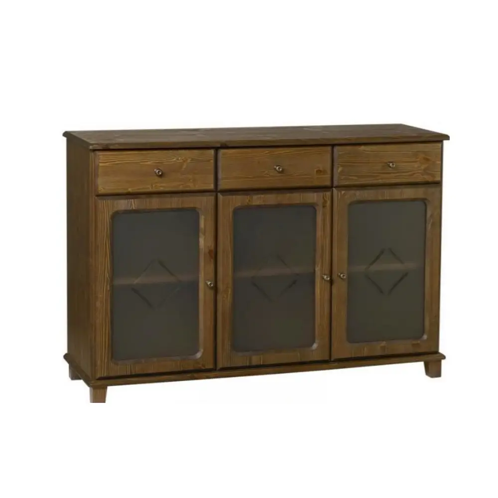 Senkissä on kolme lasiovellista kaappia sekä vetolaatikoita, joissa on metalliset liukukiskot sujuvaa käyttöä varten. Valittavissa oleva kirkas tai etsattu lasi salmiakkikuvioinnilla tuo kokonaisuuteen ripauksen eleganssia ja korostaa senkin viimeisteltyä ilmettä. Rusko Mäntysenkki 135303 tarjoaa runsaasti säilytystilaa niin astioille kuin kodin koriste-esineille, tehden siitä täydellisen valinnan olohuoneeseen tai ruokailutilaan.