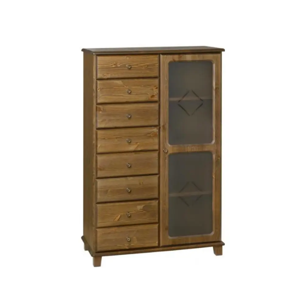 Rusko Mäntyvitriinikaappi 92108 on suomalainen massiivimäntyinen vitriinikaappi, jossa yhdistyvät salmiakkikuvioidut lasiovet, kahdeksan vetolaatikkoa ja ajaton design. Sen laadukas rakenne ja muunneltavat yksityiskohdat tekevät siitä kestävän ja tyylikkään osan kotisi sisustusta.
