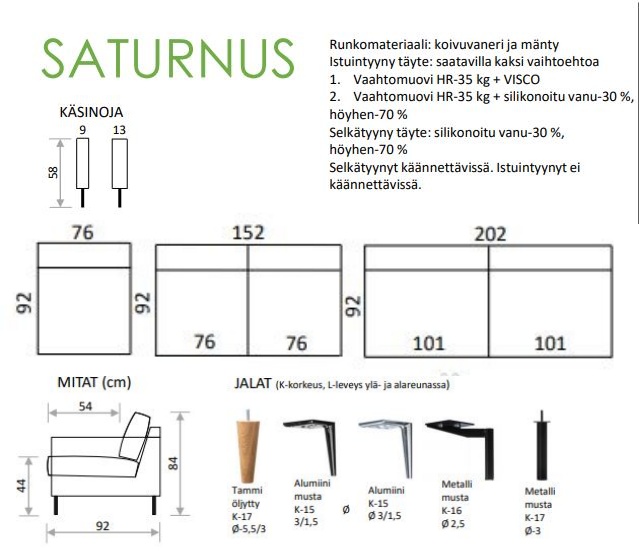 | 100 cm | 92 cm | 84 cm | cm | cm | cm | cm | 44.46 cm | cm | 54 cm | 15.18 cm | cm | cm | cm | cm | cm | cm | 9.13 cm | Istuimissa zigzag jousitus, istuintyyny vaahtomuovi 35HR, Jämäkkä istuintyyny, Kiinteä istuintyyny | Käännettävä selkätyyny | cm | cm | cm | cm | cm | cm | cm | cm | cm | cm | Cinema kangas, Suma kangas, Sundsvall kangas | Massiivipuu, Vaneri | cm | kg | cm | cm | cm |