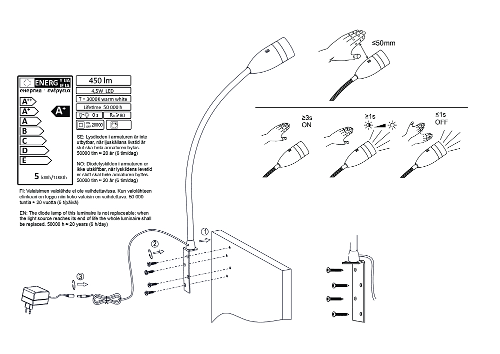 • Helppo asennus ja käyttö: Valaisin voidaan kiinnittää vaivattomasti esimerkiksi sängynpäätyyn, ja integroitu himmenninkytkin mahdollistaa valon kirkkauden säätämisen tarpeidesi mukaan.