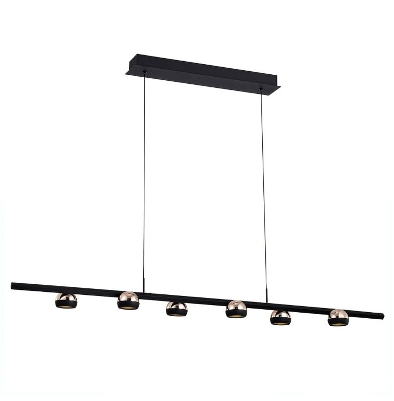 Show Horizontal riippuvalaisin tuo tilaan voimakasta visuaalista ilmettä kuudella ruusukultaisella kuvulla ja tyylikkäällä mustalla rungolla. Vaakasuuntainen muotoilu tekee valaisimesta täydellisen katseenvangitsijan ruokapöydän, keittiösaarekkeen tai neuvottelutilan ylle.