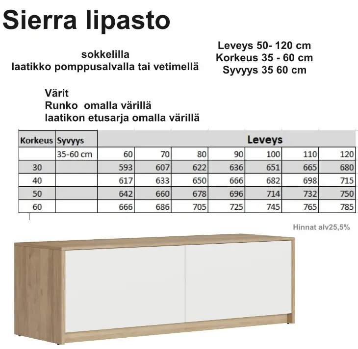 Sierra on korkealaatuinen, Suomessa valmistettu lipasto, joka mukautuu täydellisesti tarpeisiisi. Valitse leveys, syvyys ja korkeus sentin tarkkuudella – halutessasi jopa millimetrin välein. Tyylikkäässä lipastossa on 2 laatikkoa jossa pehmeästi sulkeutuva vaimennettu silent-laatikosto. Laatikosto toimii hyvin myös penkkinä. Sierra lipastoa on saatavana vain sokkelilla