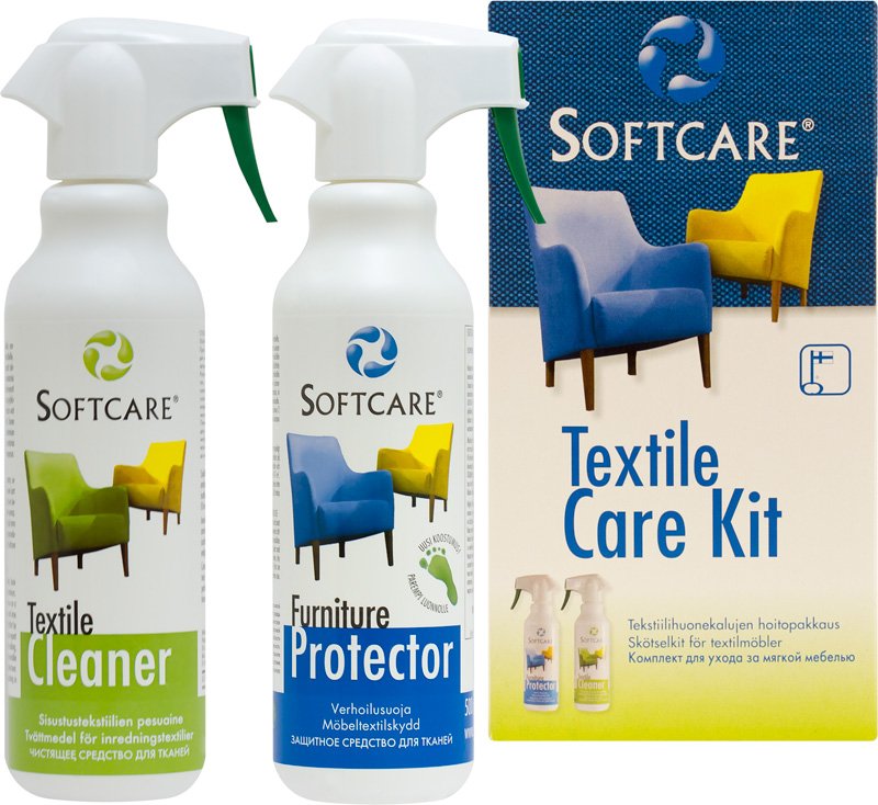 Softcare Textile Care Kit -pakkauksessa on kaikki, mitä tarvitset verhoiltujen tekstiilikalusteiden hoitoon. Softcare 500 ml tekstiilisuoja riittää viiden hengen sohvakaluston käyttöpintojen suojaukseen kertaalleen. Tehokkaalla Softcare 500 ml tekstiilinpesuaineella voi pestä sisustustekstiilejä ja verhoiltuja kalusteita sekä poistaa kaikenlaisia tahroja erilaisilta pinnoilta. Lisäksi pakkauksessa on froteeliina ja kirjalliset käyttöohjeet.