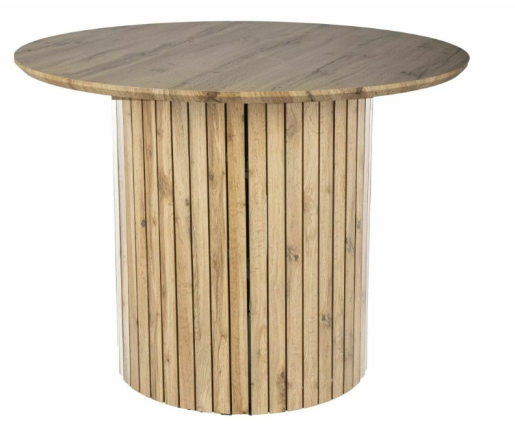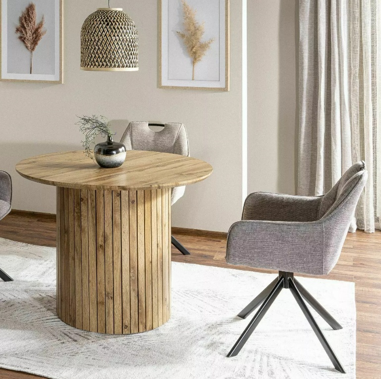 Sokrates pyöreä ruokapöytä yhdistää kauniin tammensävyisen pinnan ja näyttävän modernin rimajalan, joka tekee siitä elegantin katseenvangitsijan ruokailutilaasi. Sen harmoninen ulkonäkö sopii saumattomasti niin klassisiin kuin moderneihin sisustuksiin.