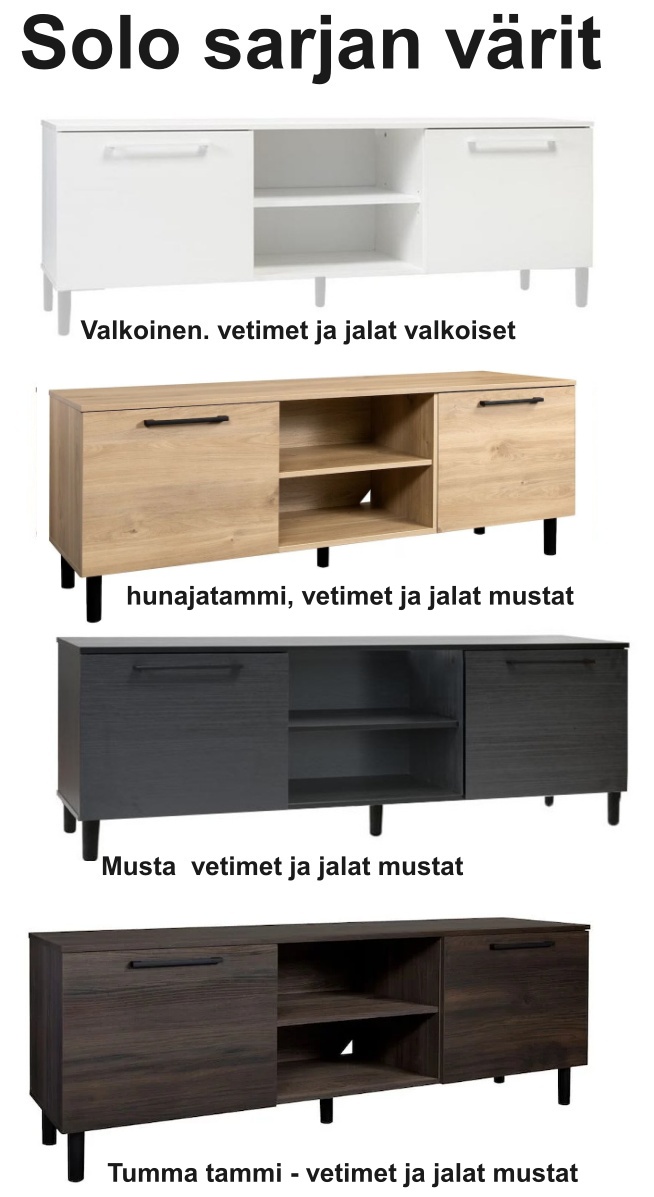 Solo TV-taso 220 cm on näyttävä ja käytännöllinen valinta, joka yhdistää modernin designin ja selkeät linjat. Saatavilla neljässä tyylikkäässä värissä – valkoinen, musta, tammi ja tumma tammi – se mukautuu täydellisesti erilaisiin sisustustyyleihin ja tuo olohuoneeseen viimeistellyn ilmeen.