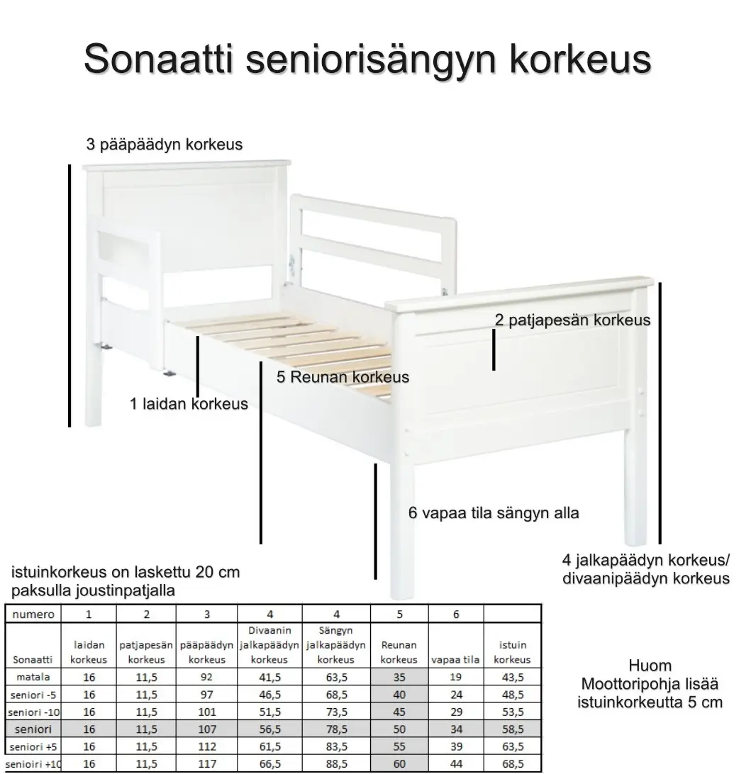 Sonaatti seniorisänky on Suomessa valmistettu koivurunkoinen laatuhuonekalu, joka tarjoaa erinomaisen vakauden ja pitkäikäisyyden. Sälepohja tuo vuoteeseen joustavuutta ja tukea, ja vahva rakenne varmistaa turvallisen nukkuma-alustan vuosiksi eteenpäin. Mallivaihtoehtoina ovat klassinen sänky jalkapäädyllä sekä moderni divaanimalli ilman jalkapäätyä – lisäksi sänky on saatavilla myös erikoisko’oissa yksilöllisiin tarpeisiin.