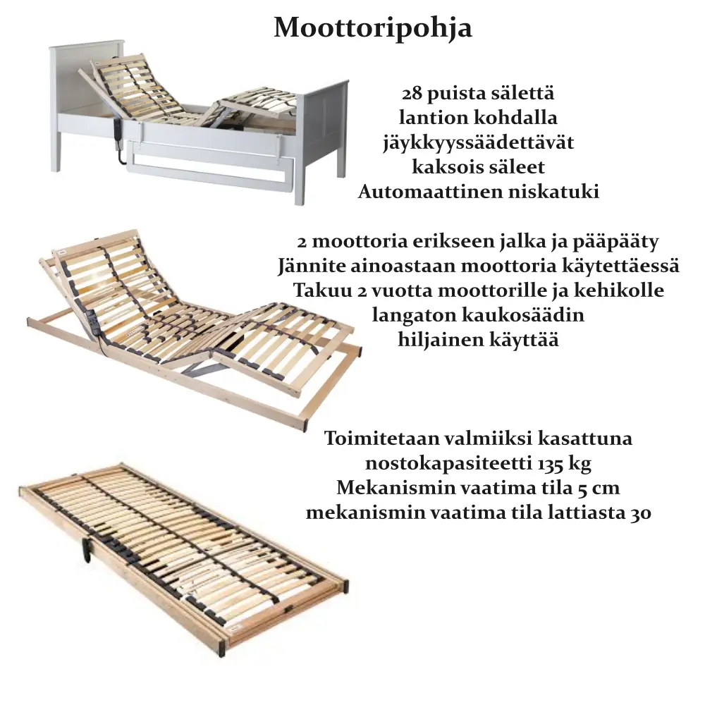 Sängyn voi täydentää korkealaatuisilla joustin- ja sijauspatjoilla, jotka mukautuvat erilaisten käyttäjien tarpeisiin ja tarjoavat optimaalisen tuen. Saatavilla on myös sijauspatjansuojia sekä XXL-vaihtoehtoja, kuten extra-tukijalka ja patja, jonka painoraja on jopa 160 kg. Näiden ansiosta Sonaatti-seniorisängystä tulee kokonaisuus, joka takaa ergonomisen ja rauhallisen unen jokaiselle käyttäjälle.