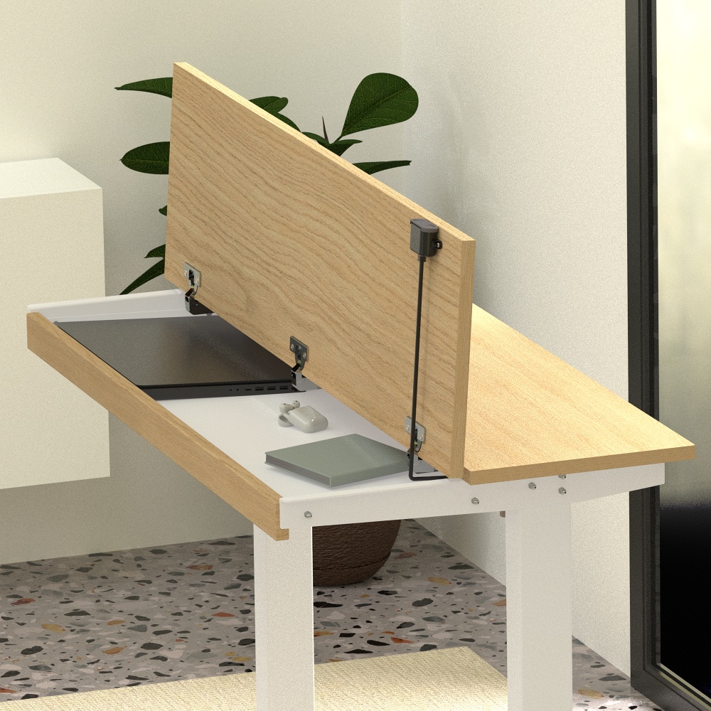 Slipt on sähkökäyttöinen työpöytä jossa on säilytystilaa kannen alla. Säilytä paperisi, koneesi kannen alla kunne tarvitset niitä sillä pöytätason alla olevaan säilytystilaan mahtuu helposti kannettava tietokone ja tyypilliset toimistotarvikkeet, ja pöydän alla on vielä jalkatilaa mukavasti istuakseen. Split kirjoituspöytä on tyylikäs huonekalu sijoitat sen kotonasi mihin vain samalla parannat kodin ergonomiaa ja mukavuutta. Työpöytä ei näytä perinteiseltä korkeussäädettävältä pöydältä, mutta siinä on kaikki perinteisen sähköisen tuöpöydän edut säilytystilalla. Splitissä on saranoitu pöytälevy, jonka alla on piilotettu säilytystila, joka auttaa pitämään asuintilasi järjestyksessä.