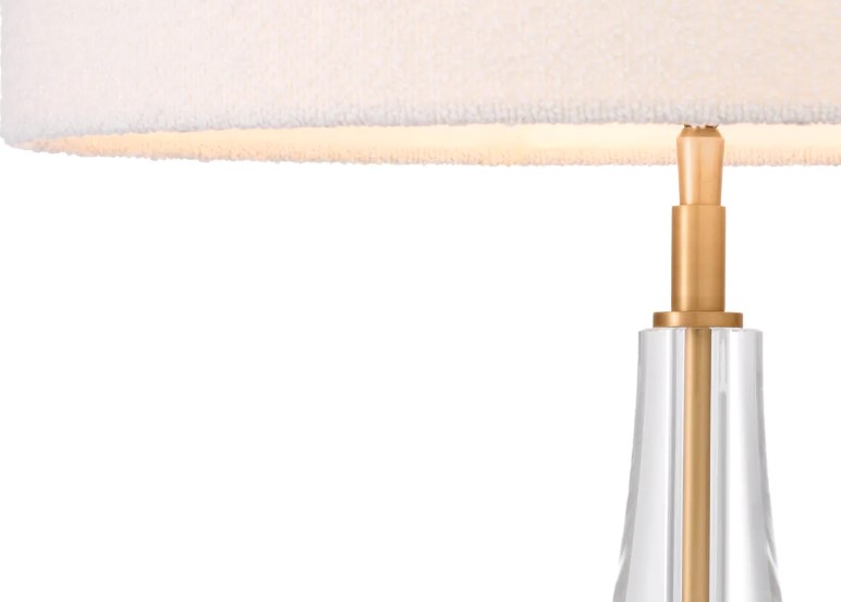 Teräksestä, polyvinyylikloridista ja lasista valmistettu rakenne takaa pitkäikäisen laadun ja vakaan käyttökokemuksen. Valkoinen boucle-varjostin sekä messingin ja kirkkaan lasin yhdistelmä sopivat täydellisesti monenlaisiin sisustustyyleihin, tuoden tilaan modernia eleganssia.