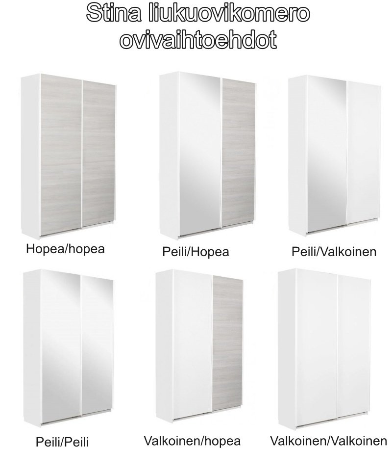 Stina liukuovikomero yhdistää modernin muotoilun ja toiminnallisuuden, tarjoten monipuoliset ovivaihtoehdot jokaiseen makuun. Voit valita puuovet, peiliovet tai niiden tyylikkään yhdistelmän, jotka tuovat tilaan avaruutta, valoisuutta ja viimeistellyn ilmeen.