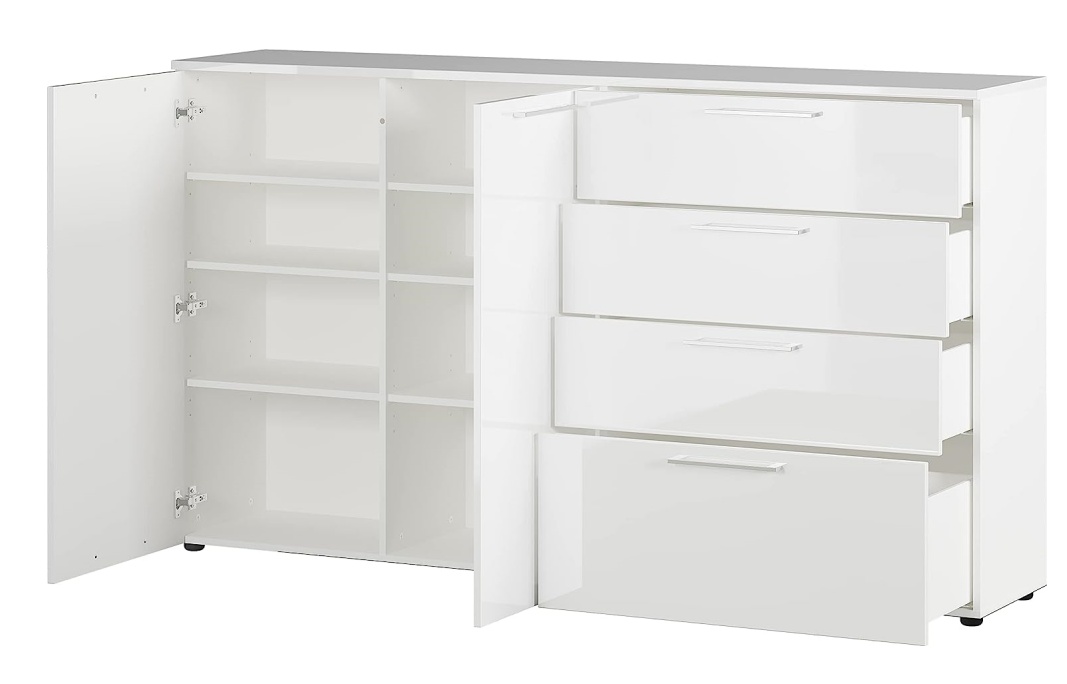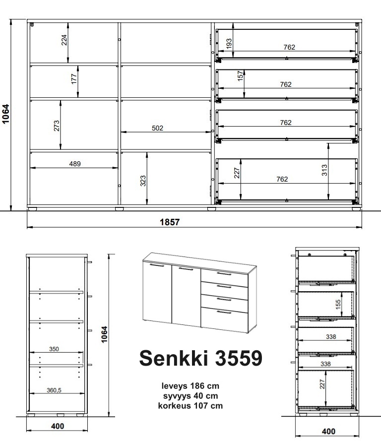 Lämpömuovattu MDF ja melamiinihartsipintainen kalustelevy takaavat erinomaisen kestävyyden ja helppohoitoisuuden, mikä tekee senkistä pitkäikäisen valinnan. Tuote on saatavana osina tai valmiiksi koottuna lisähinnasta, ja sen tukeva 88 kg rakenne korostaa laatua ja luotettavuutta.