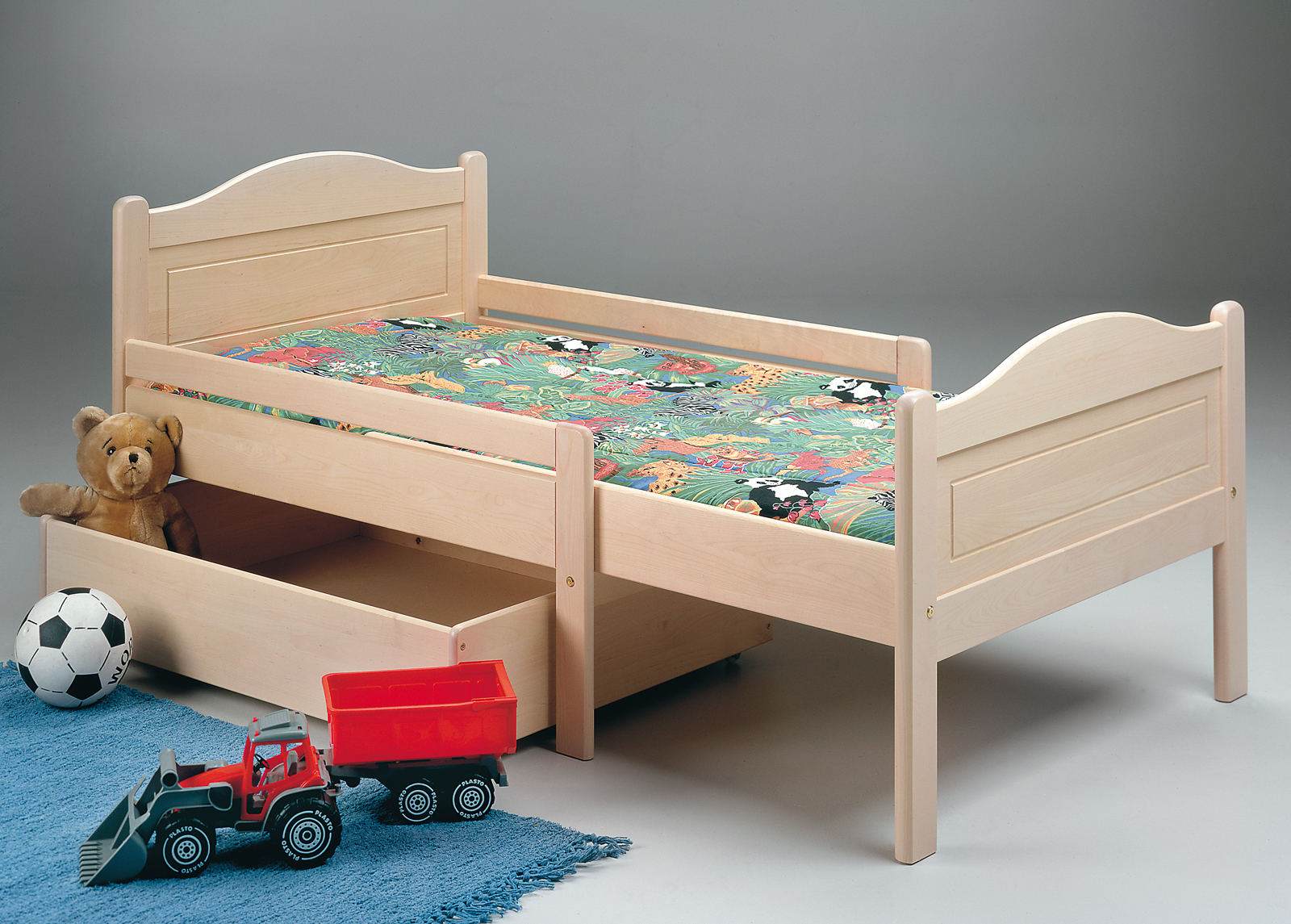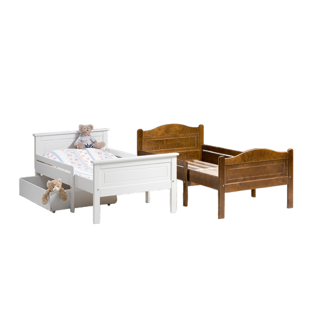 Sänky sisältää tukevan sälepohjan, ja siihen on mahdollista tilata lisätarvikkeina yhteensopiva lelulaatikko tai juuri tarpeisiin sopiva patja. Näin voit räätälöidä kokonaisuuden täydellisesti oman perheesi arkeen.