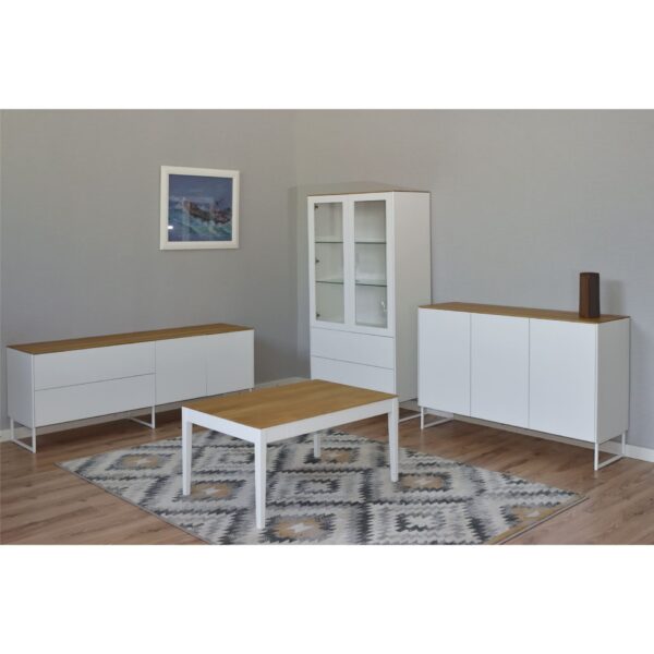 Runkoväriksi valittavissa oleva valkoinen tai musta yhdistyy näyttävästi tammen sävyiseen kanteen, luoden modernin ja ajattoman kokonaisuuden. Tammi, MDF ja kalustelevy muodostavat kestävän rakenteen, joka kestää arjen käyttöä ja säilyttää ilmeensä vuodesta toiseen.