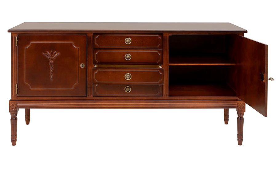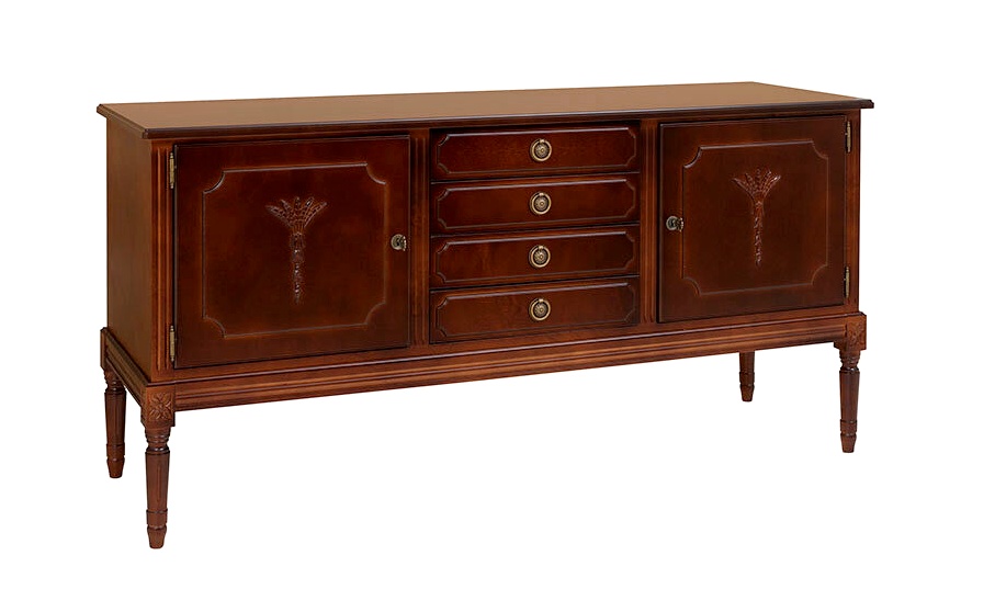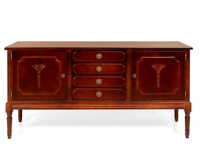 Tämä näyttävä empiretyylinen astiakaappi on yhtä aikaa käytännöllinen ja arvokas sisustuksen katseenvangitsija. Molemmissa reunoissa on kaapit korkeussäädettävillä hyllyillä ja keskellä neljä tilavaa laatikkoa, jotka tarjoavat runsaasti säilytystilaa.