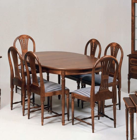 Ruokailuryhmä sisältää jatkettavan ruokapöydän sekä neljä verhoiltua Tähkäempire-tuolia, jotka tuovat kotiin klassista eleganssia. Lisätuoleja ja käsinojallisia tuoleja voi tilata erikseen, jolloin ryhmän voi laajentaa juuri tarpeiden mukaan. (Miljöökuvissa esillä Hepplewhite-tuolit.)