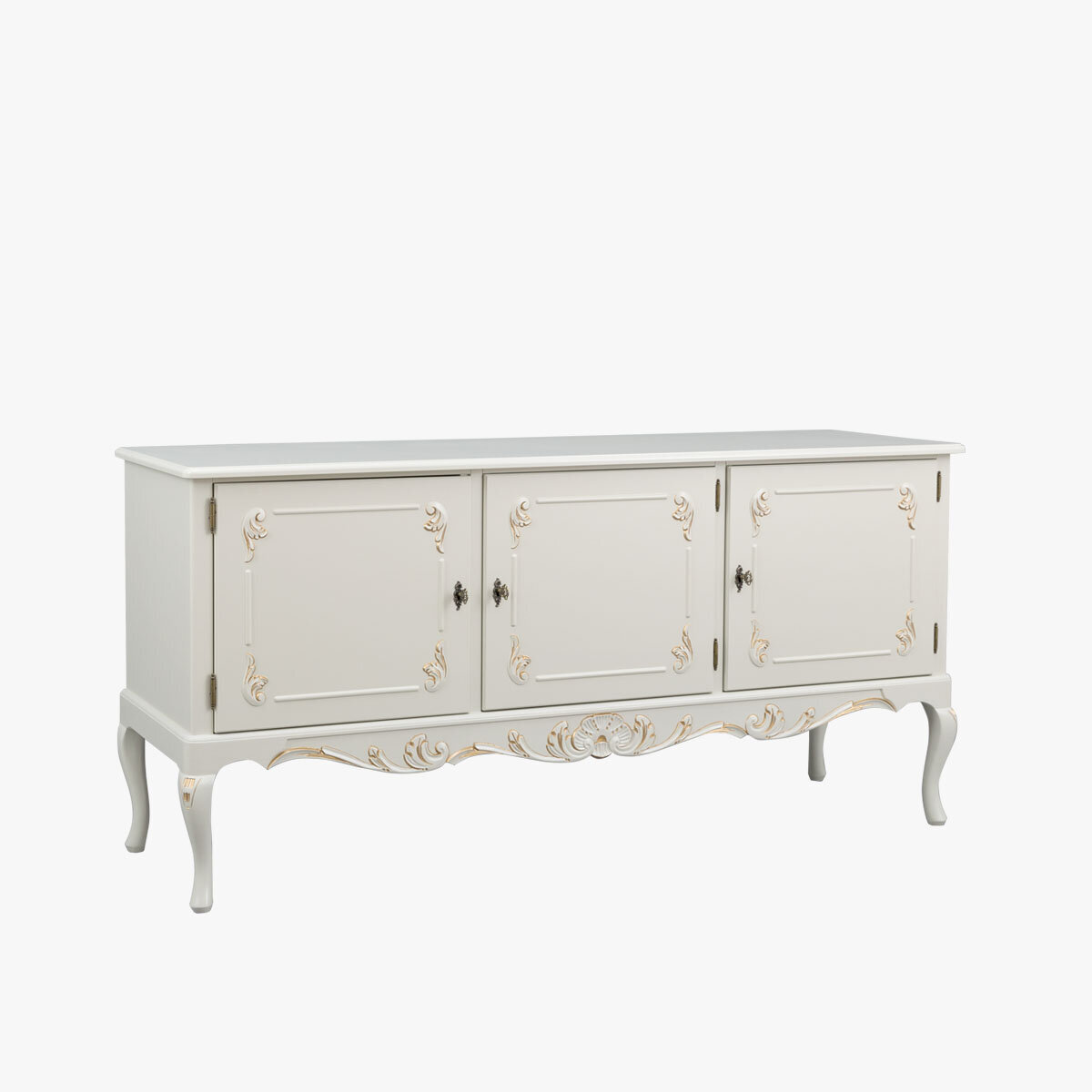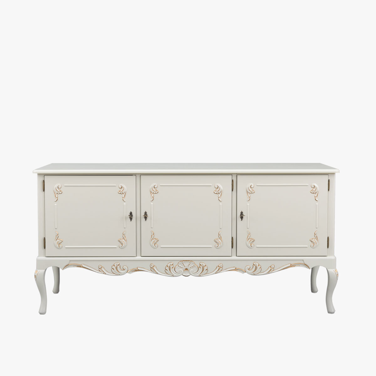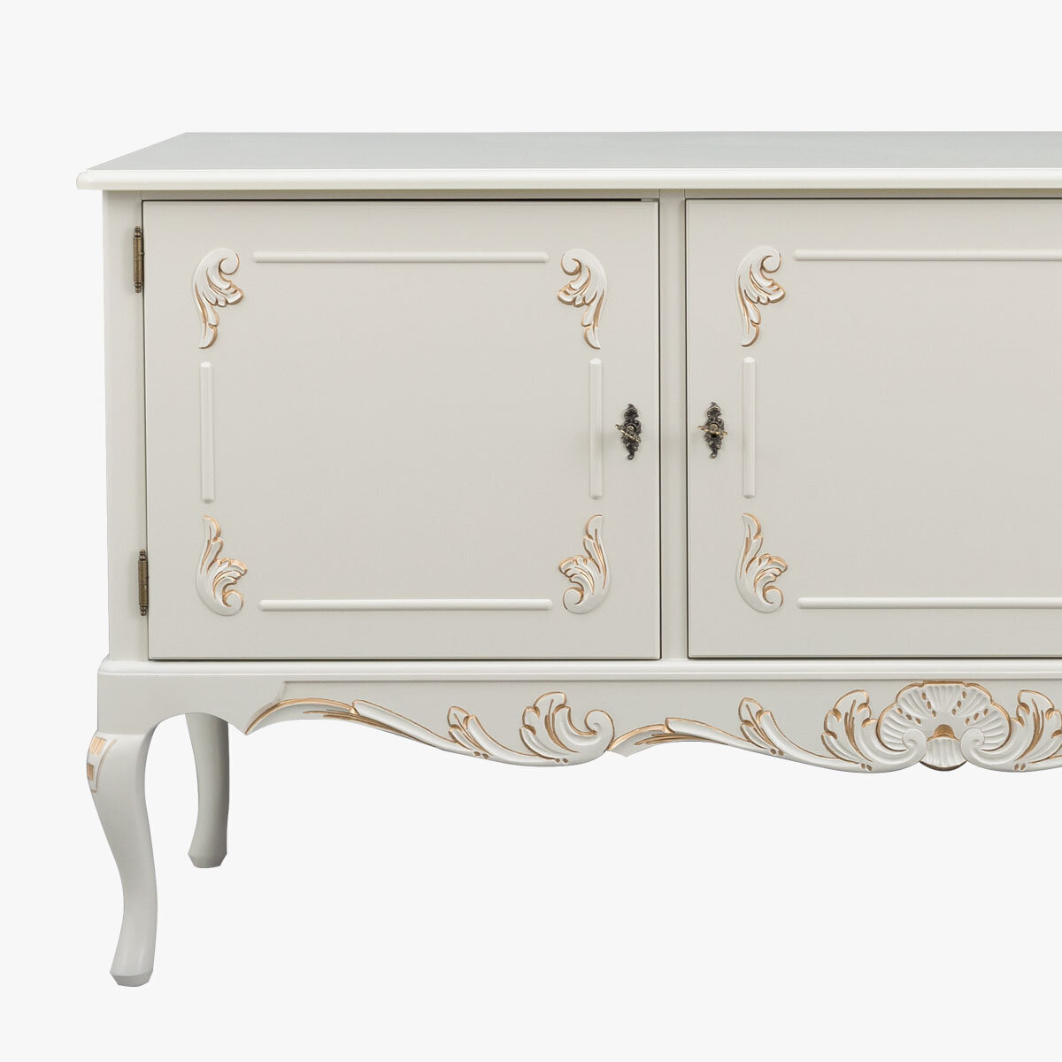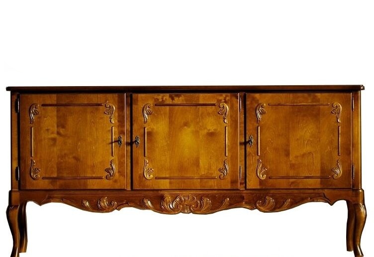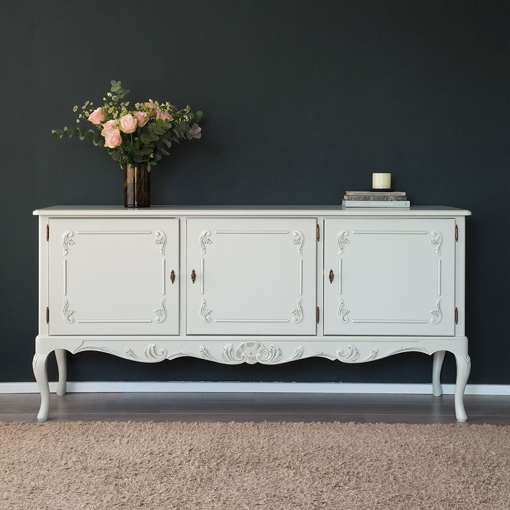 Kaappia koristavat käsin veistetyt yksityiskohdat, ovien kauniit lehtiornamentit sekä alaosan näyttävä rocaille-kuvio, jota täydentävät messingin väriset, antiikkipatinoidut helat. Saatavana useissa väreissä, ja lisäeleganssia tuo käsin maalattu kullan- tai harmaanvärinen patinointi.