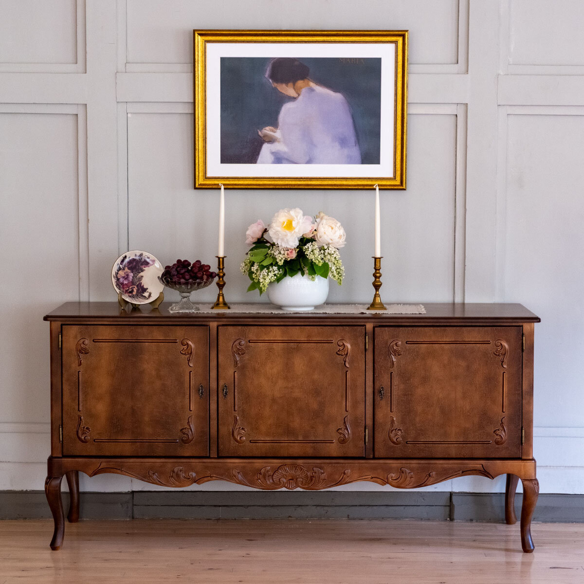 Tämä upea Talonpoikaisrokokoo-astiakaappi yhdistää perinteisen muotoilun, käytännöllisen säilytystilan ja ajattoman arvokkuuden. Kolme lukollista kaappia tarjoavat monipuoliset säilytysmahdollisuudet: reunakaapeissa on siirrettävät hyllylevyt ja keskiosassa neljä kätevää laatikkoa.