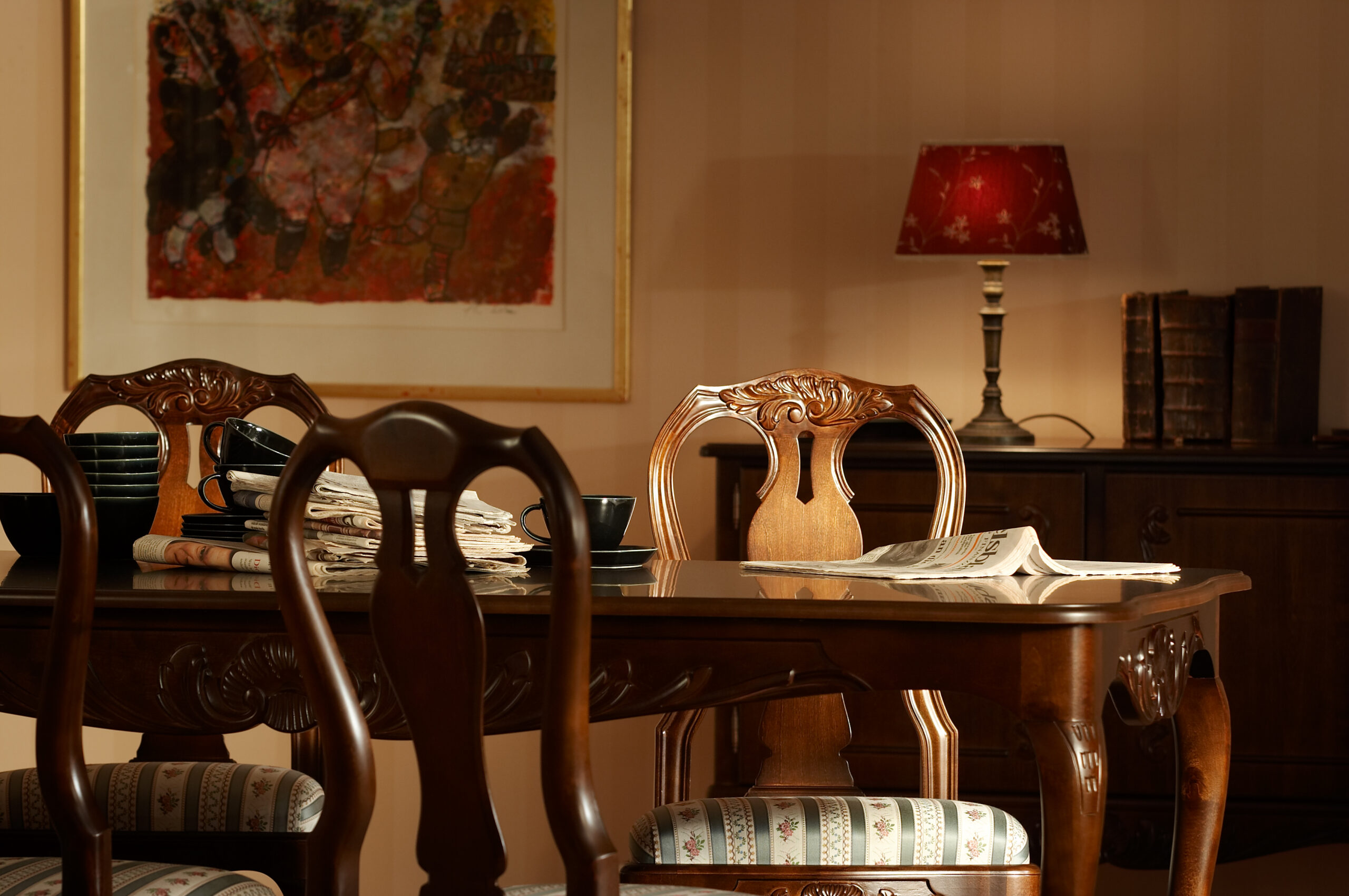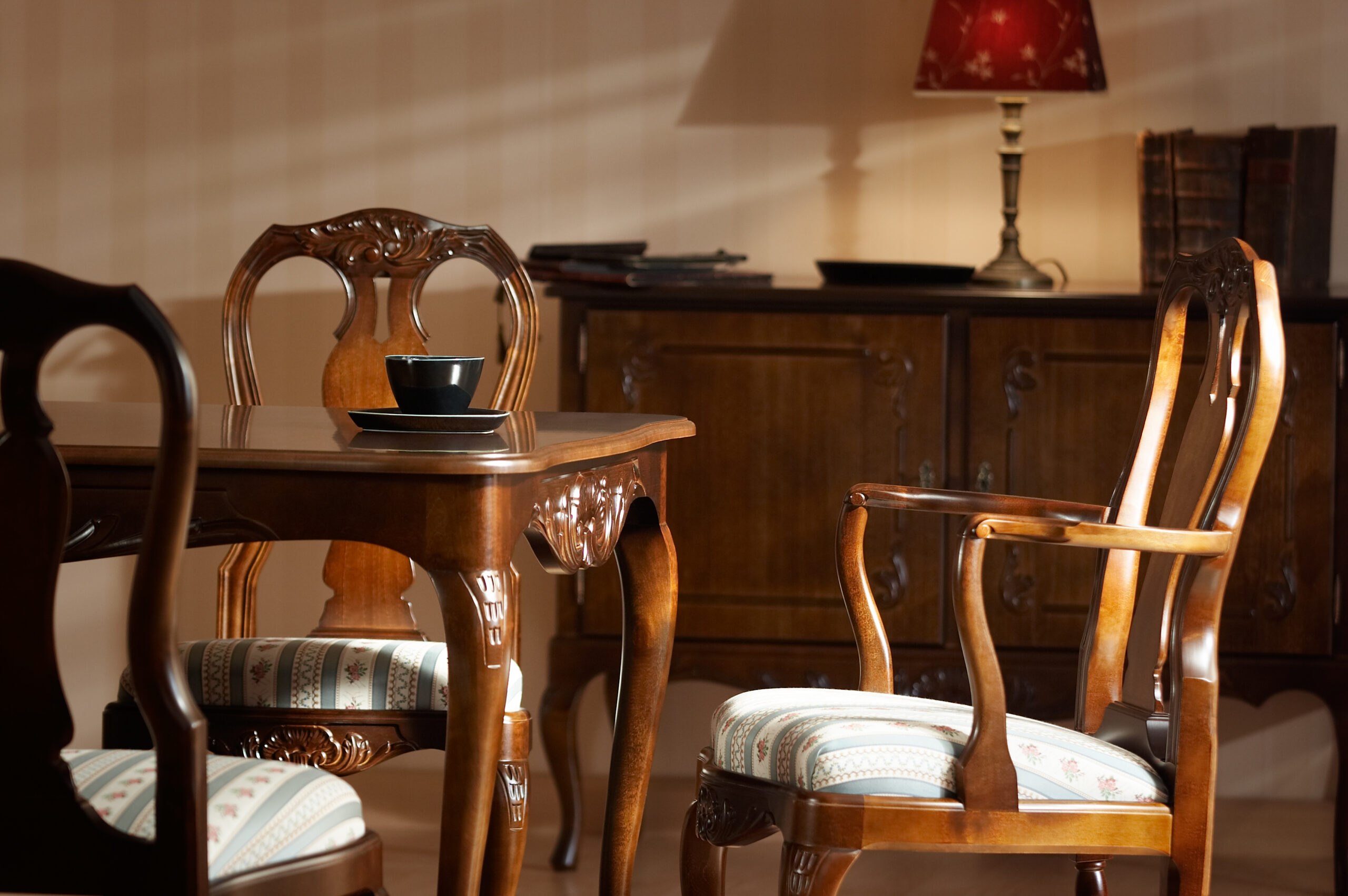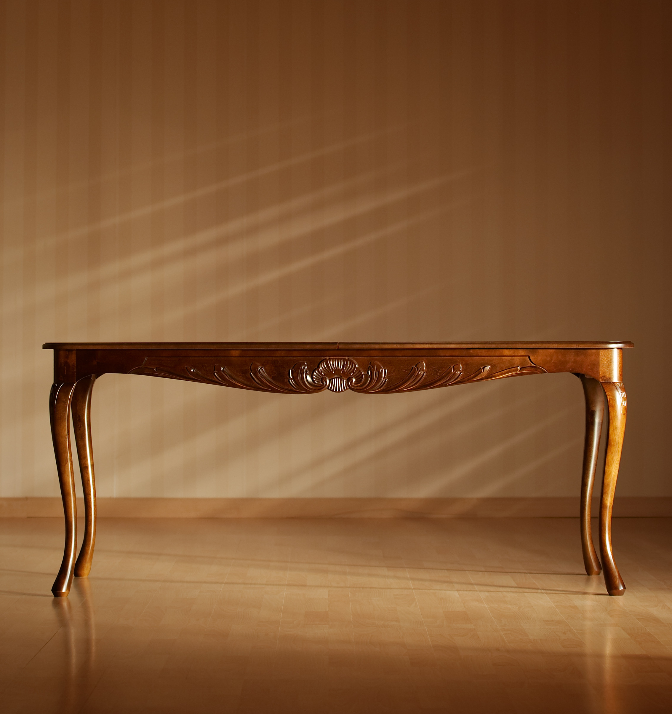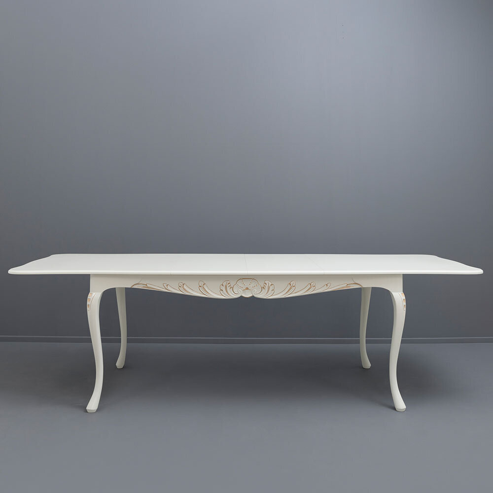 Tämä suorakaiteen muotoinen Talonpoikaisrokokoo-ruokapöytä yhdistää perinteisen muotoilun ja käytännöllisen jatkomekanismin. Kahden jatkopalan ansiosta pöytä tarjoaa runsaasti tilaa, ja sen ajaton muotoilu tekee siitä näyttävän keskipisteen niin perheen arkiruokailuissa kuin juhlallisissa illallisissa.