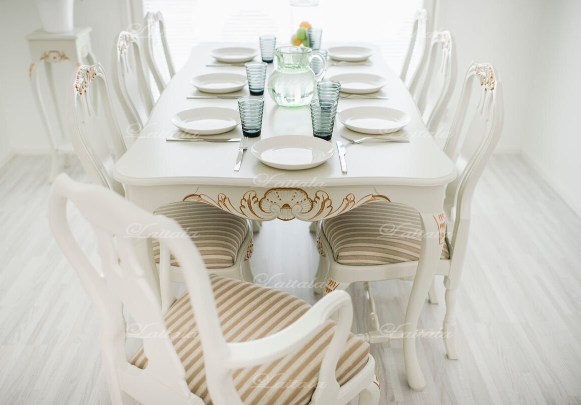 Kotimainen jatkettava suorakaiteen mallinen Talonpoikaisrokokoo ruokapöytä – kaunista käsityötä arkeen ja juhlaan