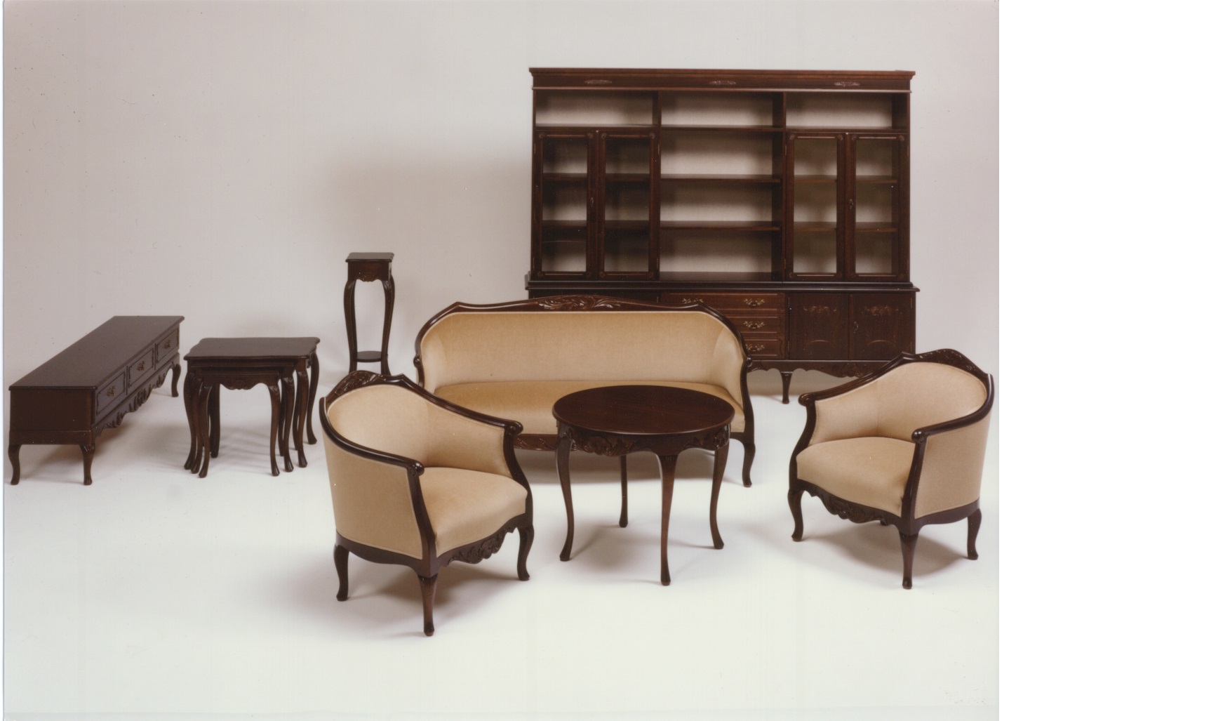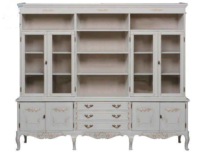 Tämä upea talonpoikaisrokokoo-kirjahylly yhdistää perinteisen muotoilun ja monipuolisen säilytystilan. Molemmissa reunoissa on vitriinikaapit, keskiosassa laatikosto avohyllyillä ja yläosassa avohyllyt, jotka tarjoavat runsaasti tilaa kirjoille, koriste-esineille ja tärkeille tavaroille.