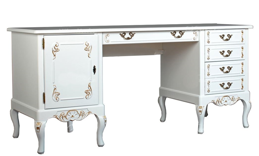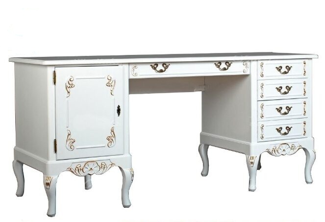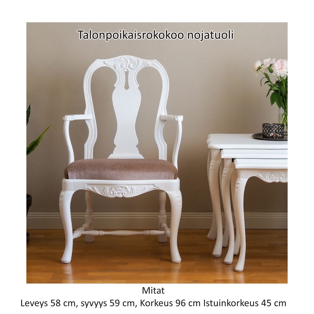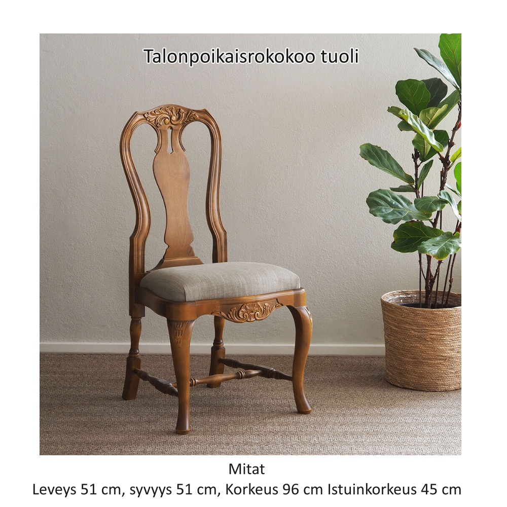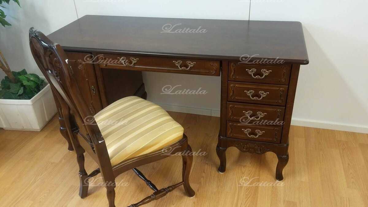 Pöydässä on monipuolisesti säilytystilaa: vasemmalla puolella kaappi siirrettävällä hyllylevyllä, oikealla neljä laatikkoa ja keskellä työtason alla yksi leveämpi laatikko. Tilaa toimistotarvikkeille ja tärkeimmille papereille löytyy siis runsaasti. Kokonaisuuden täydentää kauniisti saman sarjan Talonpoikaisrokokoo-tuoli, joka sopii täydellisesti pöydän alle ja on tilattavissa sivuiltamme.