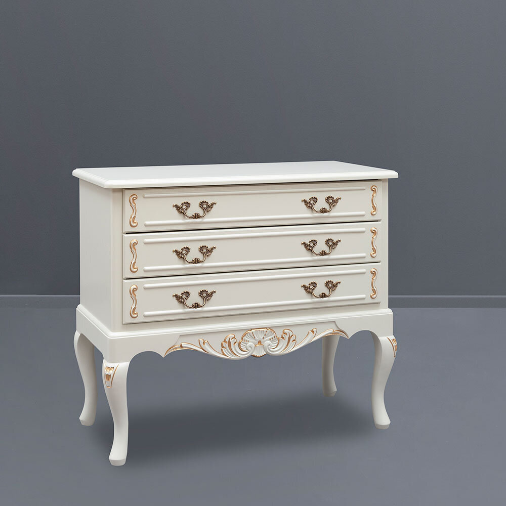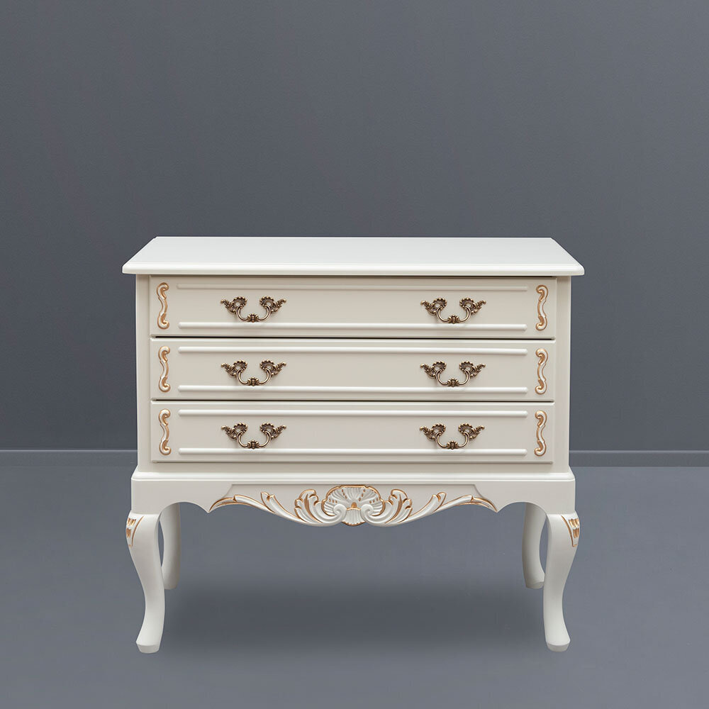 Laatikoita koristavat yksityiskohtaiset messinginväriset, antiikkipatinoidut vetimet, jotka viimeistelevät lipaston klassisen ilmeen. Valmistettu kotimaisena käsityönä, lipasto on saatavana useissa väreissä ja sen voi viimeistellä käsin maalatulla kullan- tai harmaanvärisellä patinoinnilla.