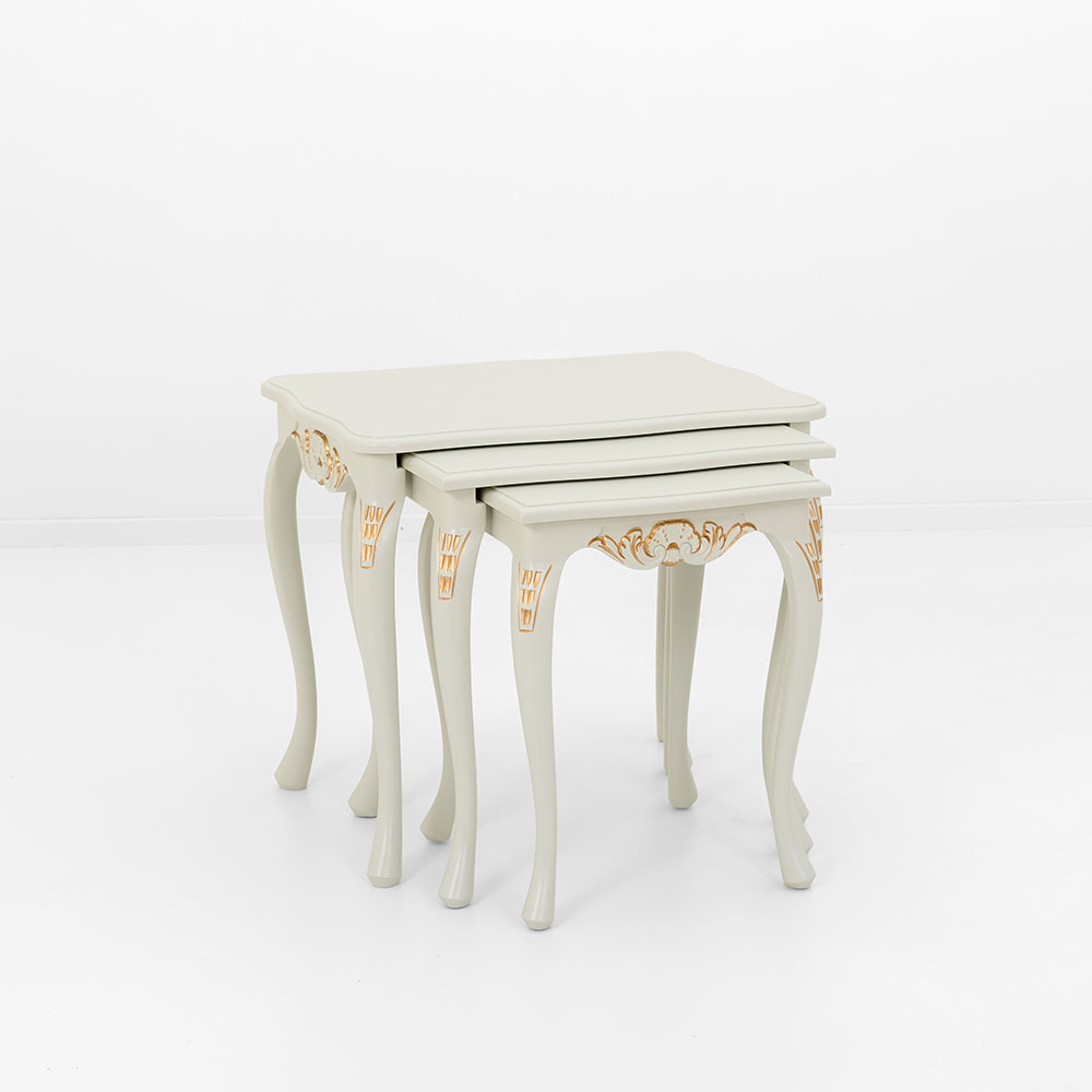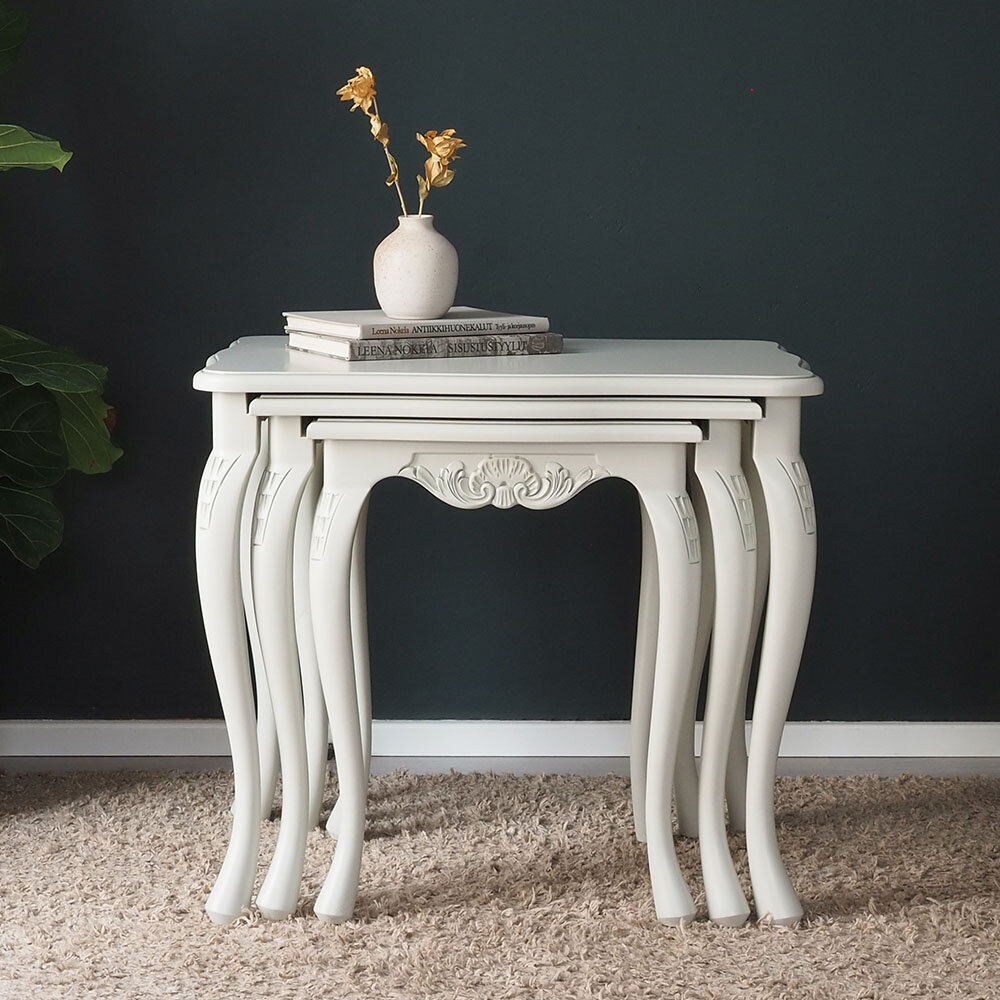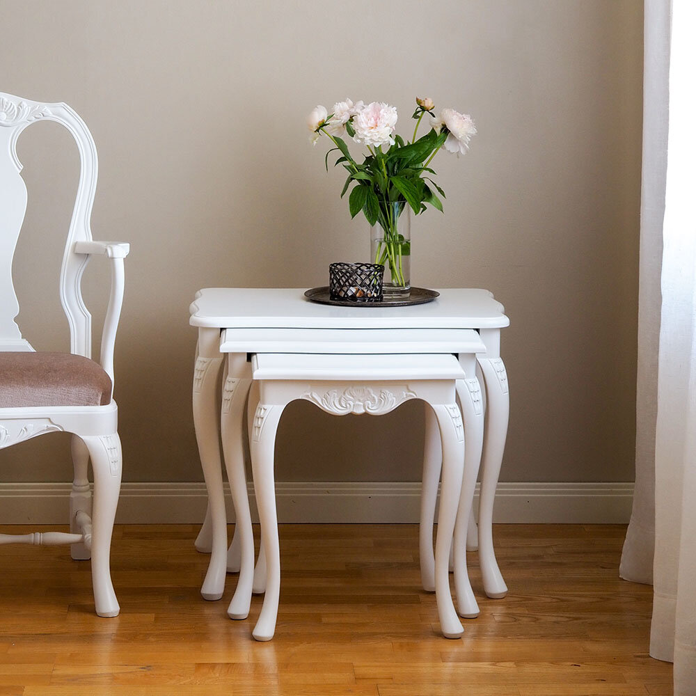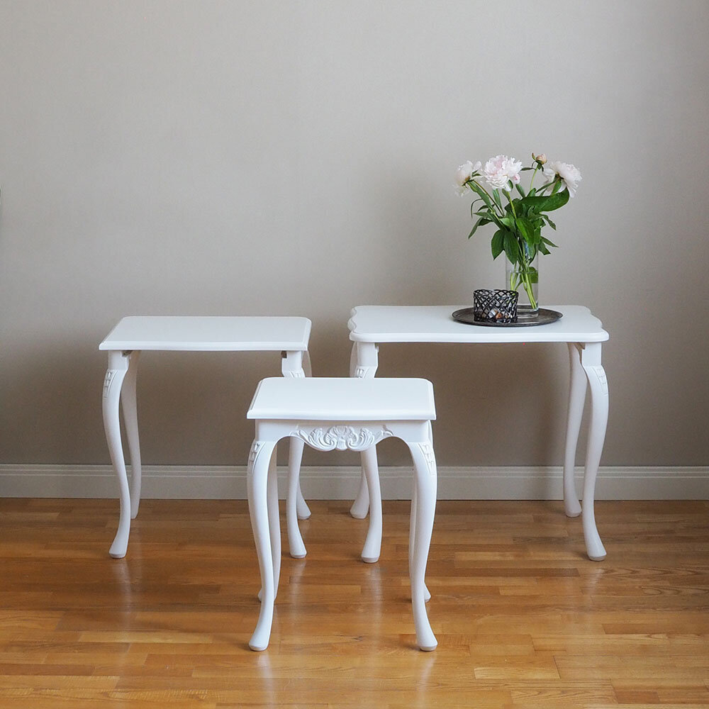 Tämä kaunis Talonpoikaisrokokoo-sarjapöytäsetti sisältää kolme erikokoista pöytää, jotka voidaan sijoittaa sisäkkäin tai erikseen tarpeen mukaan. Tyylikkäät rokokootyylille ominaiset yksityiskohdat ja sirot muodot tekevät pöydistä monikäyttöisen ja näyttävän lisän kodin sisustukseen.