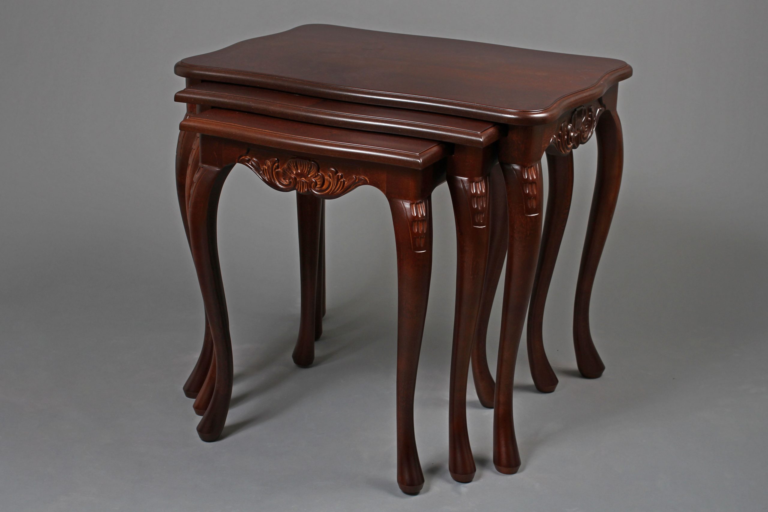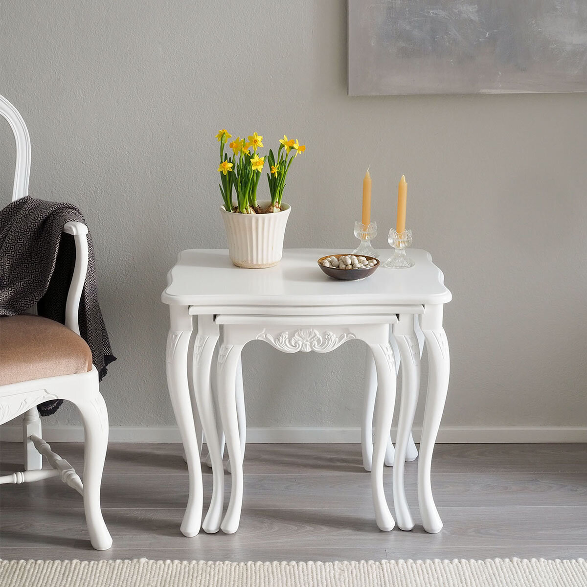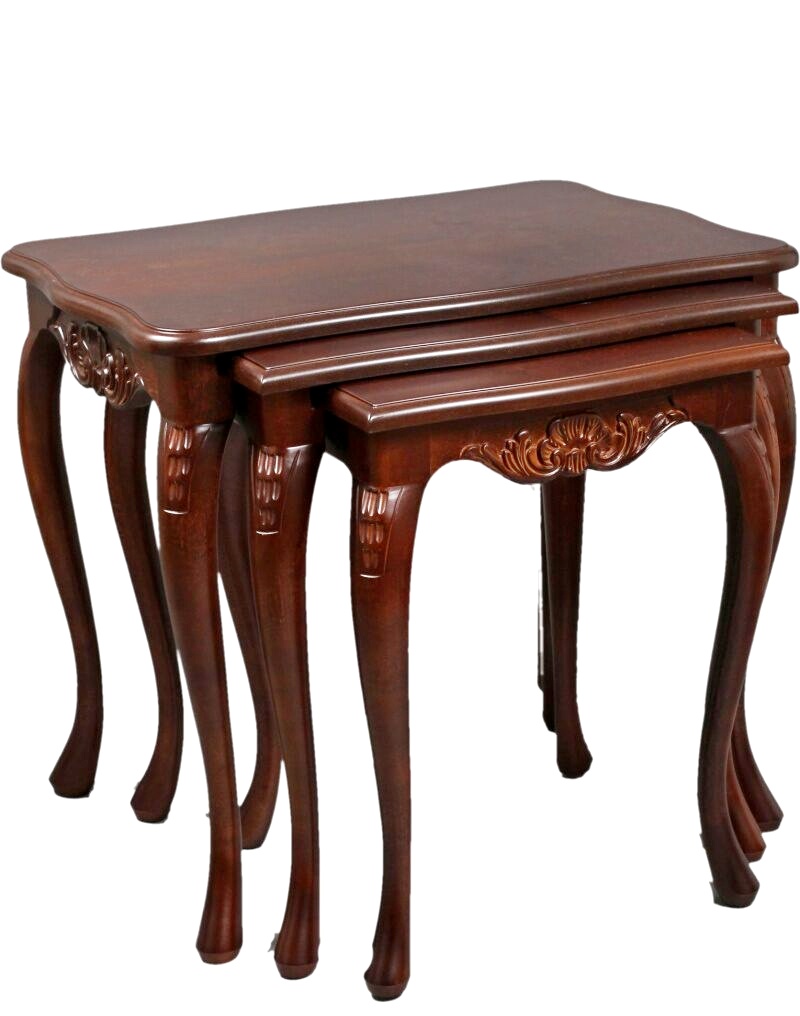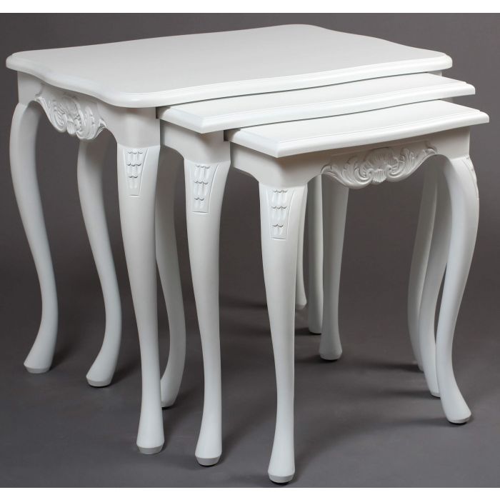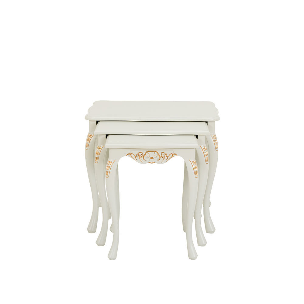 Tämä kaunis Talonpoikaisrokokoo-sarjapöytäsetti sisältää kolme erikokoista pöytää, jotka voidaan sijoittaa sisäkkäin tai erikseen tarpeen mukaan. Tyylikkäät rokokootyylille ominaiset yksityiskohdat ja sirot muodot tekevät pöydistä monikäyttöisen ja näyttävän lisän kodin sisustukseen.