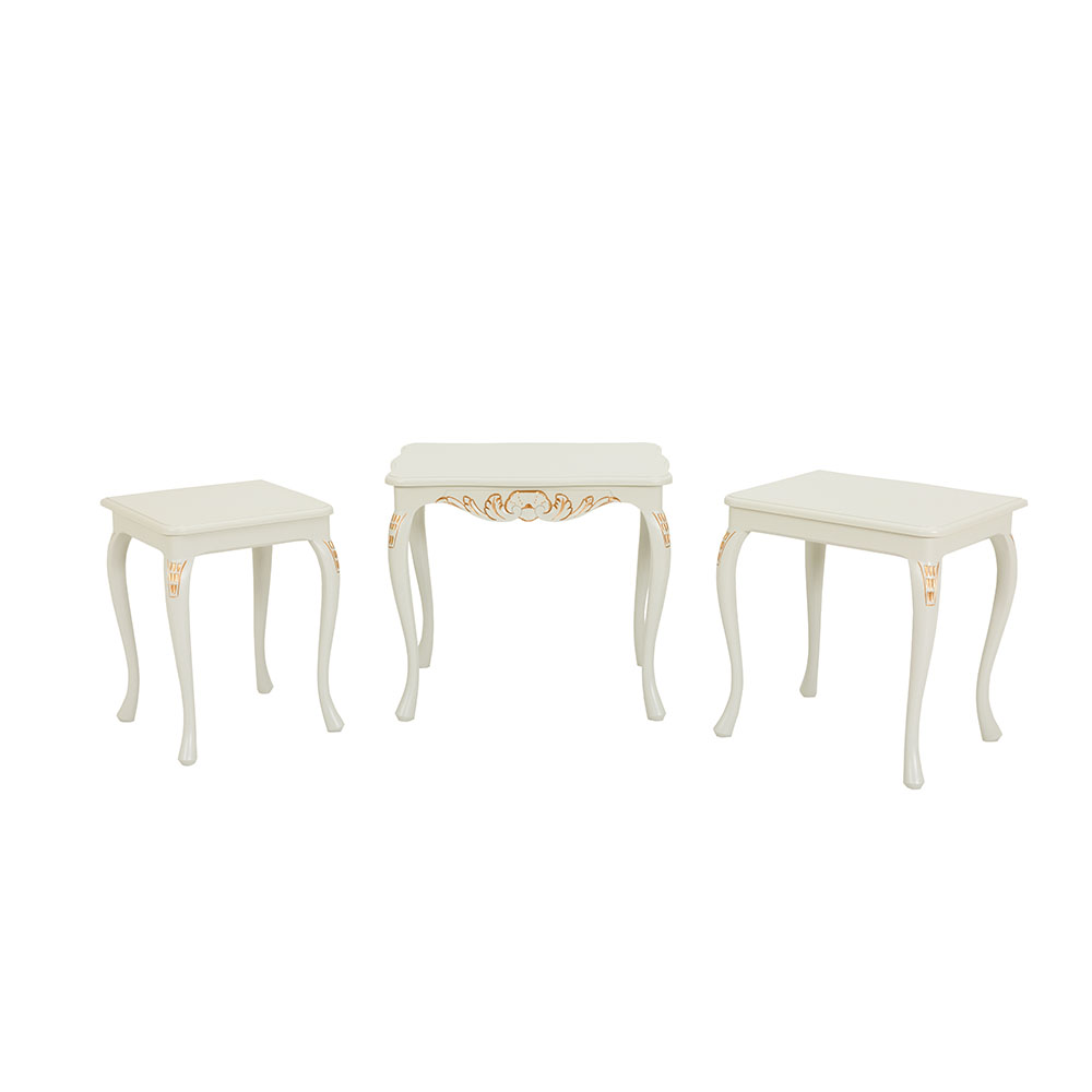 sisältää kolme erikokoista pöytää, jotka voidaan sijoittaa sisäkkäin tai erikseen. Saatavana useissa väreissä sekä käsin maalatulla kulta- tai harmaapatinoinnilla – toimitetaan valmiiksi koottuna, pöydät tilattavissa myös yksittäin asiakaspalvelusta.