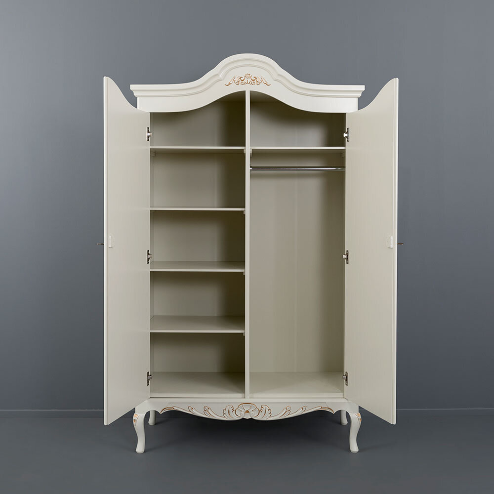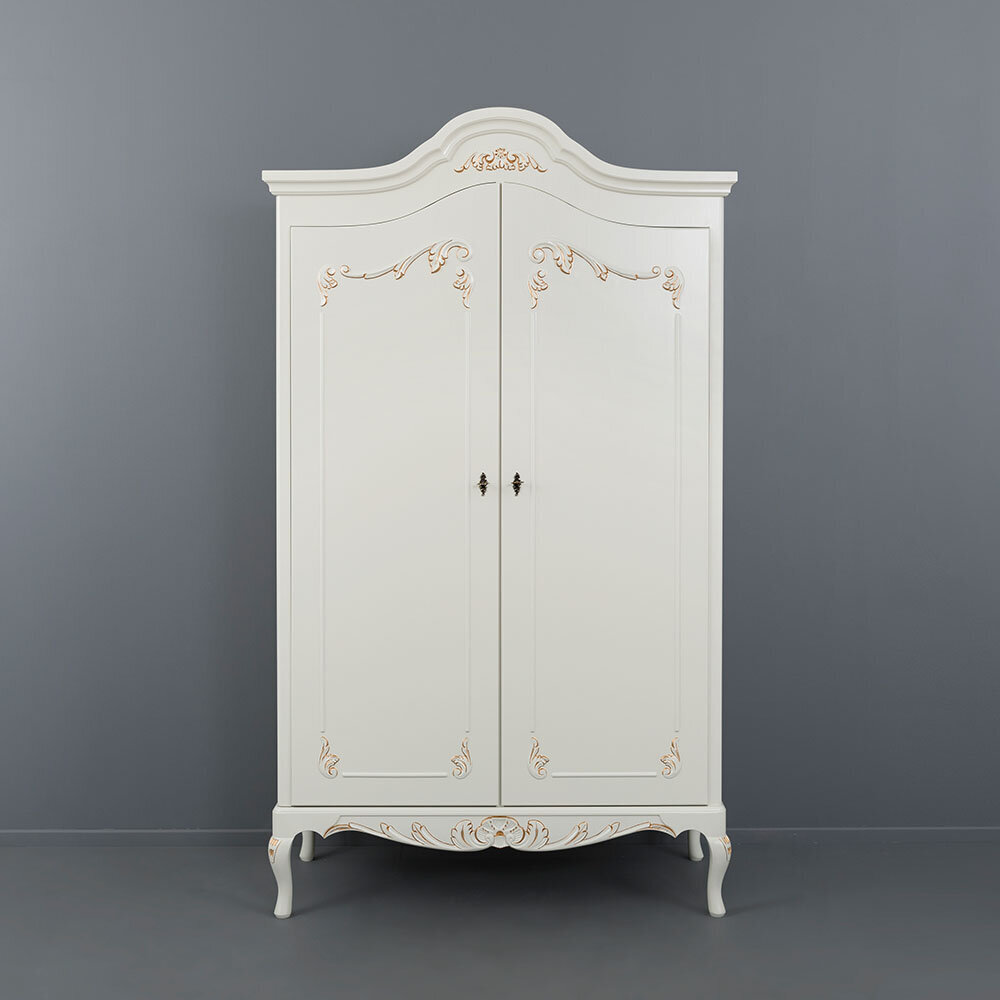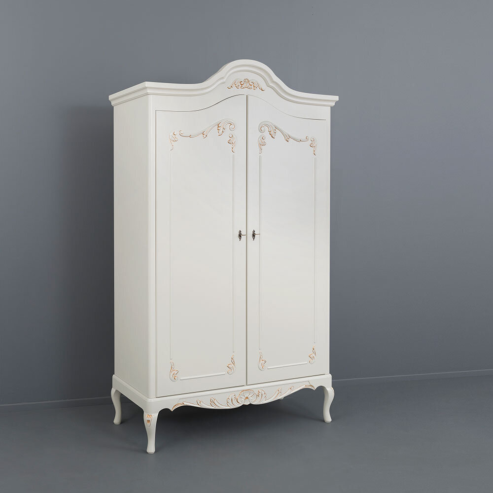 Tämä näyttävä kaksiosainen Talonpoikaisrokokoo-vaatekaappi yhdistää ajattoman muotoilun ja käytännöllisyyden. Vasemmalta puolelta löytyy neljä hyllylevyä liinavaatteille ja kodintekstiileille, oikealta taas hattuhylly sekä messinginvärinen vaatetanko henkarivaatteiden säilytykseen. Kaappi on lukollinen, mikä tuo lisää käytännöllisyyttä arkeen.