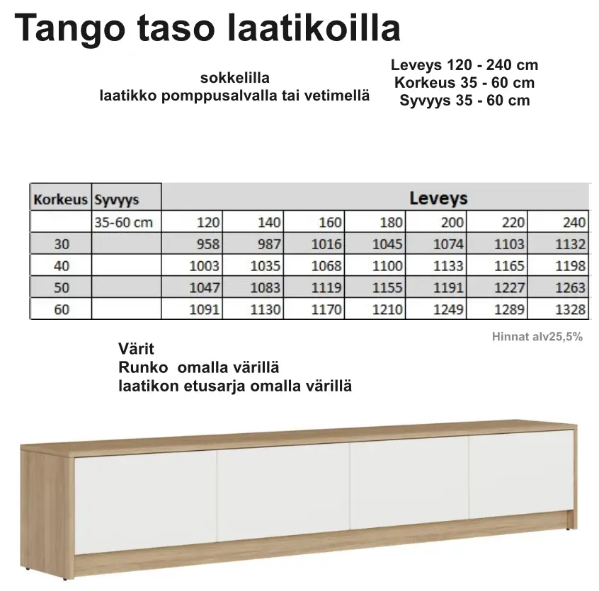 Tango on korkealaatuinen, Suomessa valmistettu taso, joka mukautuu täydellisesti tarpeisiisi. Valitse leveys, syvyys ja korkeus sentin tarkkuudella – halutessasi jopa millimetrin välein. Tyylikkäässä tasossa on 4 laatikkoa jossa pehmeästi sulkeutuva vaimennettu silent-laatikosto. taso toimii hyvin myös penkkinä. Tango tasoa on saatavana vain sokkelilla.