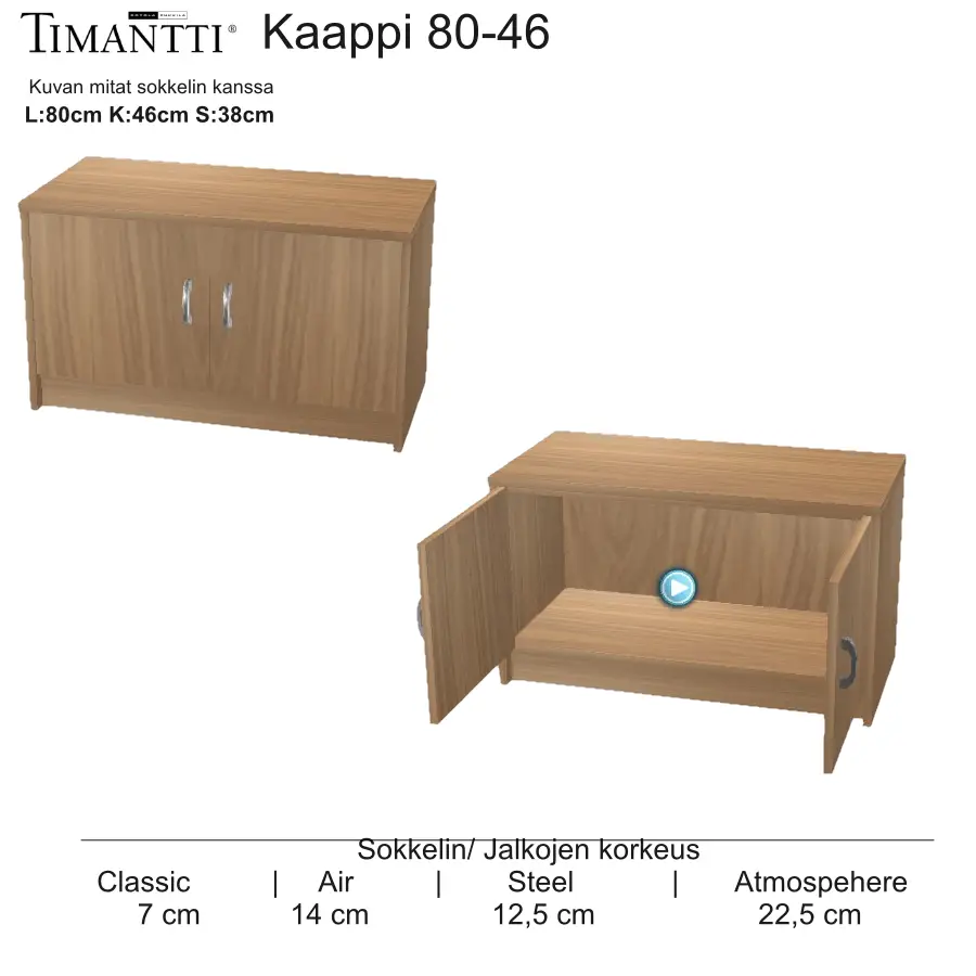 | 80 cm | 53-76 cm | 109.5 cm | cm | cm | cm | cm | cm | cm | cm | 14 cm | cm | cm | cm | cm | cm | cm | cm | cm | cm | cm | cm | cm | cm | cm | cm | cm | cm | cm | Tilaustuote | Elementit valmiiksi kasattu, Toimitus runko koottuna vain jalat/sokkeli ja kansi kiinnitetään | kg | Musta, Pähkinä, Tammi, Valkotammi, Valkoinen maalattu | Sokkeli, Air puujalka 47080, Atmosphere puujalka 47080-2, Steel metallijalka 7080-hopea, Steel metallijalka 447080-musta | Puukansi 310 KA •80 cm | 101 A, 7101 A, 7121 AOK | umpiovi • 209 UOM, umpiovi • 214 UOK | Pinta aitoa puuviilua, valkoisessa allergiatestattu kalustelevy jossa maali on vesiohenteinen ja liuotinvapaa, Näkyvät reunat massiivilistoitettuja eli täyttä puuta, Puujalat massiivipuuta, Vetimet metallia, Ovissa soft close mekanismi | Puuhylly | Vakio M3, Ferro Musta, Ferro Harmaa | Suomi | cm | cm | cm |