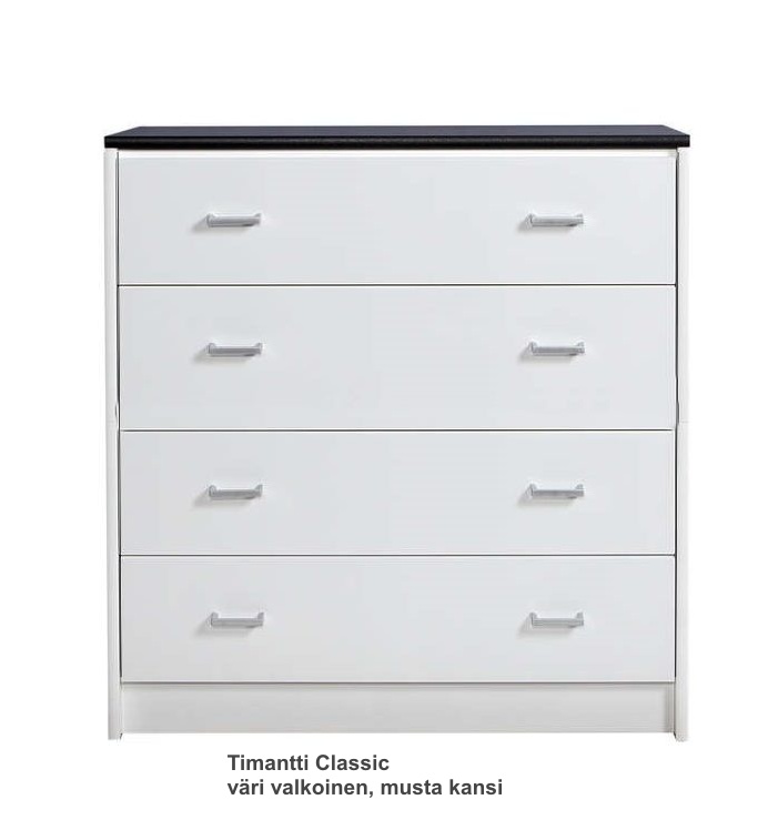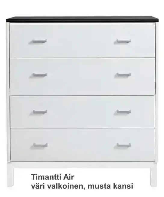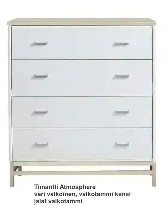 Neljä laadukasta laatikkoa metallikiskoilla tarjoavat sujuvan, hiljaisen käytön ja runsaasti säilytystilaa niin makuuhuoneeseen, olohuoneeseen kuin eteiseenkin. Timantti Air -jalat voidaan valita lipaston värisiksi tai erillisiksi kontrastisävyiksi, ja vetimistä on tarjolla kolme tyylikästä vaihtoehtoa — Vakio M3, Ferro musta tai Ferro harmaa.