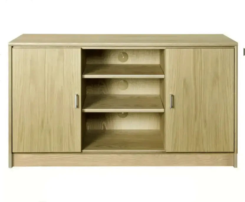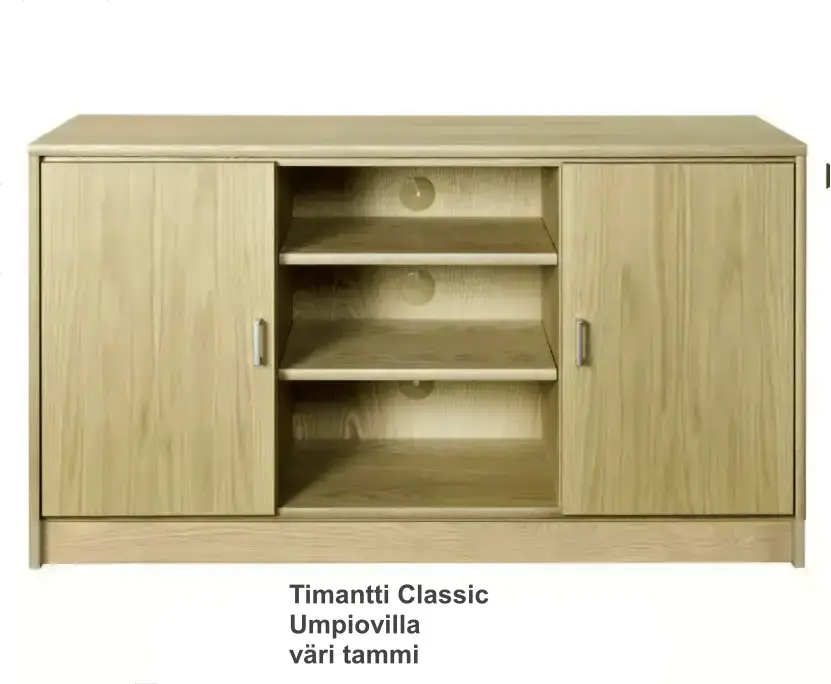 TV-taso on jaettu kolmeen osioon, joista jokaisessa on oma hylly, tarjoten runsaasti tilaa elektroniikalle ja säilytykselle. Ovet ovat valittavissa umpiovina tai vaihtoehtoisesti lasi- tai rimaovilla, ja lisäksi voit räätälöidä kalusteen värit siten, että runko ja kansi ovat samaa tai eri sävyä – myös tyylikäs lasikansi on saatavilla.