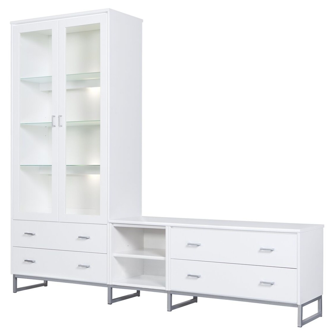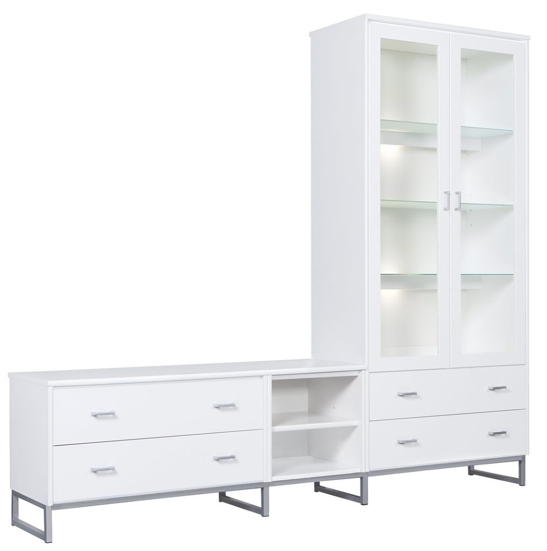 TImantti hyllyssä on toisella reunalla tvtaso laatikostolla ja avohyllyllä ja korkeampi kaappi laatikoilla ja lasikehysovilla. Voit koota kokonaisuuden myös vastapäivään tai vaihtaa ovia saadaksesi erilaisen kokonaisuuden. Kokonaisuus on suunniteltu helposti räätälöitäväksi; voit valita senkin yhdellä värillä tai yhdistellä rungon, kannen ja oven eri sävyissä sekä halutessasi vaihtaa oven mallin sisustusta korostavaksi vaihtoehdoksi. Näin kaluste mukautuu elämäntilanteen ja tarpeiden muuttuessa.