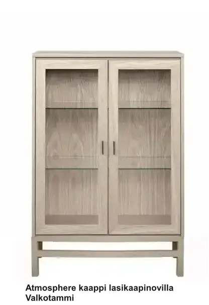 Vitriini on valmistettu aidosta puuviilusta sekä allergiatestatusta, vesiohenteisella maalilla viimeistellystä kalustelevystä. Massiivipuiset reunat, metallivetimet ja soft close -mekanismi takaavat laadukkaan tuntuman ja pitkän käyttöiän. Kaluste toimitetaan valmiiksi kasattuna, mikä tekee käyttöönotosta vaivatonta.