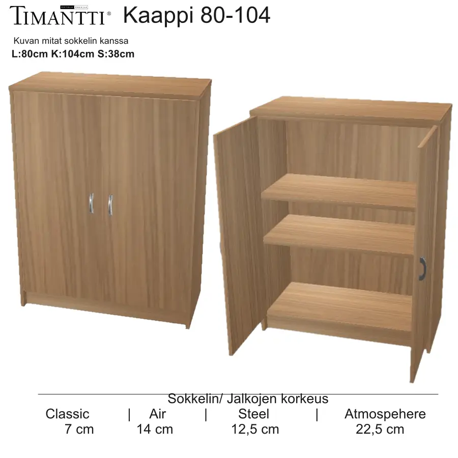 | 80 cm | 39 cm | 104 cm | cm | cm | cm | cm | cm | cm | cm | cm | cm | cm | cm | cm | cm | cm | cm | cm | cm | cm | cm | cm | cm | cm | cm | cm | cm | cm | Takuu 5 vuotta | Tilaustuote | Laatikot, hyllyt, vetimet ja ovet tulee kiinnittää itse., Toimitus runko koottuna vain jalat/sokkeli ja kansi kiinnitetään | kg | Musta, Pähkinä, Tammi, Valkotammi, Valkoinen maalattu | Sokkeli, Air puujalka 47080, Atmosphere puujalka 47080-2, Steel metallijalka 7080-hopea, Steel metallijalka 447080-musta | 121 AOK, 7121 AOK | lasikaapinovi vetimellä • 221 LK | Pinta aitoa puuviilua, valkoisessa allergiatestattu kalustelevy jossa maali on vesiohenteinen ja liuotinvapaa, Näkyvät reunat massiivilistoitettuja eli täyttä puuta, Metallijalat terästä, Puujalat massiivipuuta, sokkeli aitoa puuviilua, Vetimet metallia, Ovissa soft close mekanismi, Lasiovet karkaistua lasia | Vakio M3, Ferro Musta, Ferro Harmaa | Suomi | cm | cm | cm |