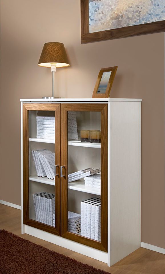 Vitriinissä on käytännöllinen hylly ja umpiovet, ja kokonaisuus on suunniteltu helposti räätälöitäväksi. Voit valita vitriinin yhdellä värillä tai yhdistellä rungon, kannen ja oven eri sävyissä sekä halutessasi vaihtaa oven mallin sisustusta korostavaksi vaihtoehdoksi. Näin kaluste mukautuu elämäntilanteen ja tarpeiden muuttuessa.