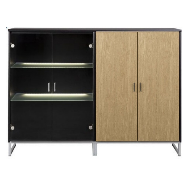 Senkissä on 2 kaappia kussakin 2 lasi tai puuhyllyä ja senkissä on toisessa satiinilasivet ja toisessa umpiovet. Kokonaisuus on suunniteltu helposti räätälöitäväksi; voit valita senkin yhdellä värillä tai yhdistellä rungon, kannen ja oven eri sävyissä sekä halutessasi vaihtaa oven mallin sisustusta korostavaksi vaihtoehdoksi. Näin kaluste mukautuu elämäntilanteen ja tarpeiden muuttuessa.