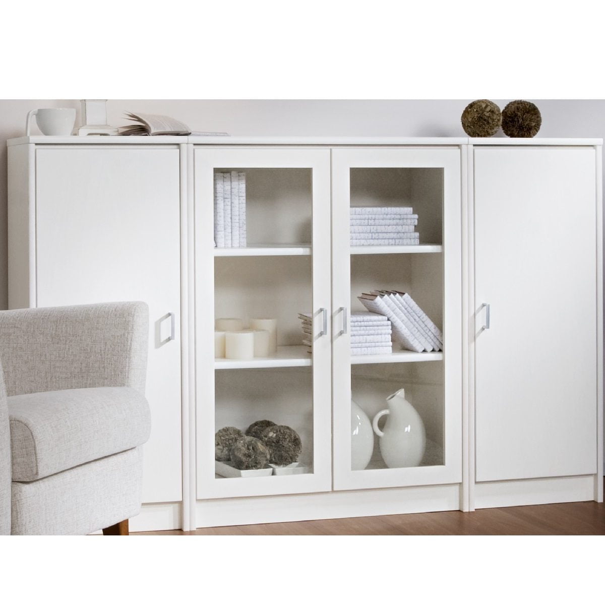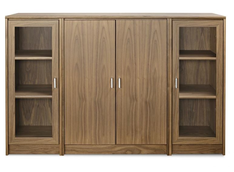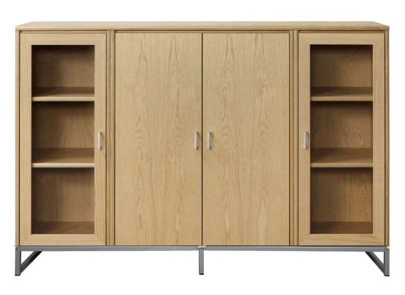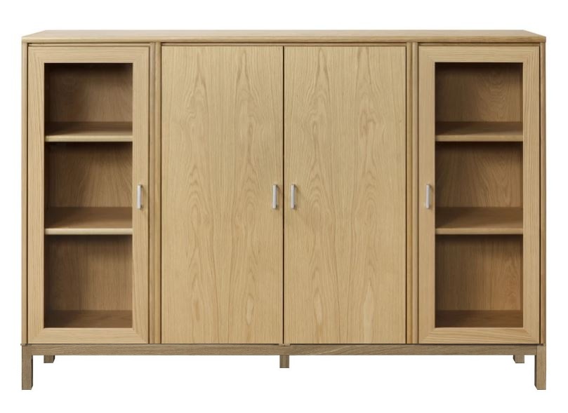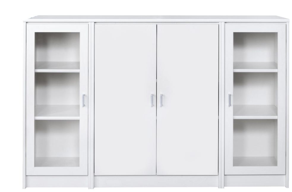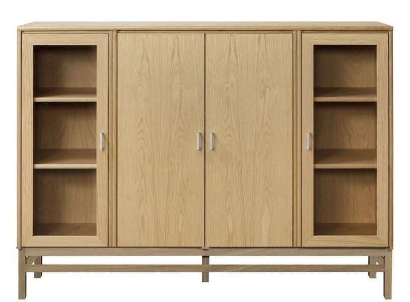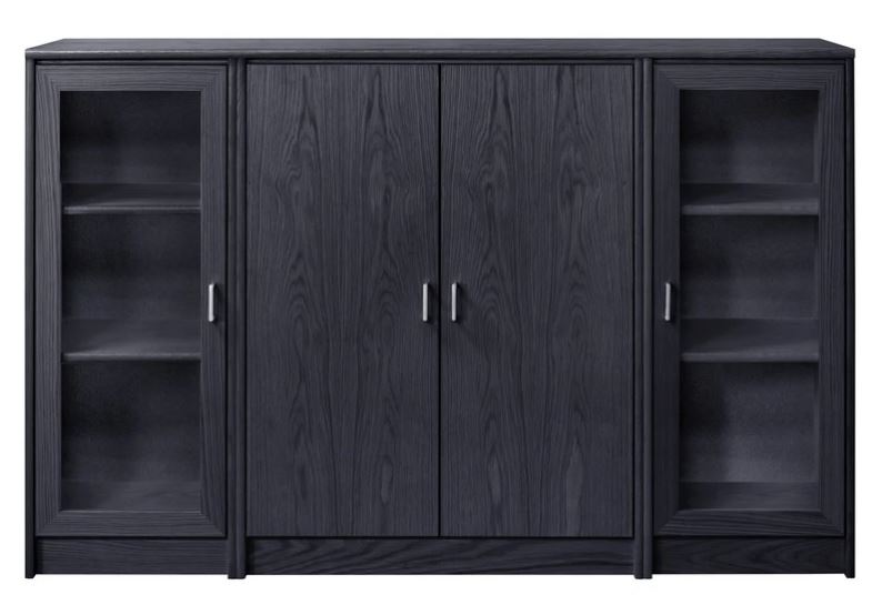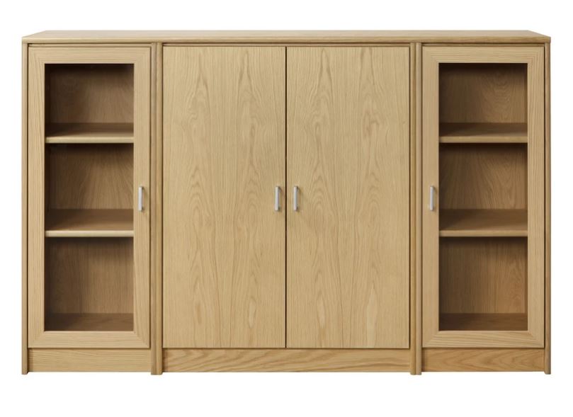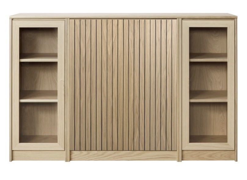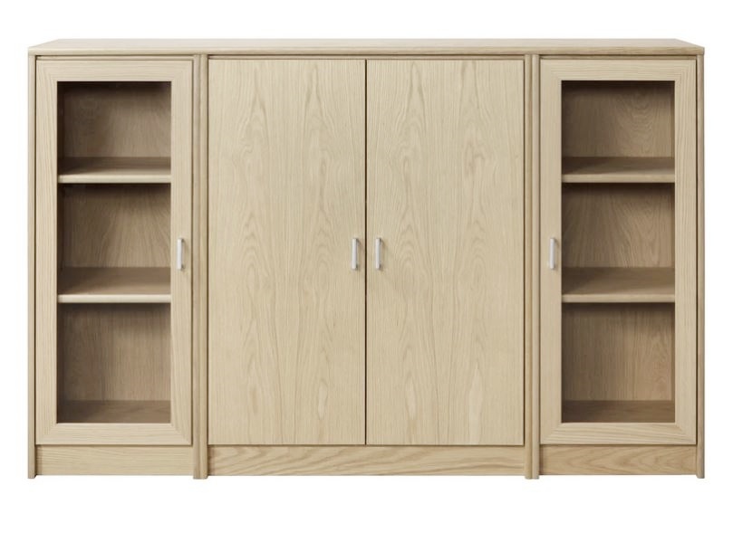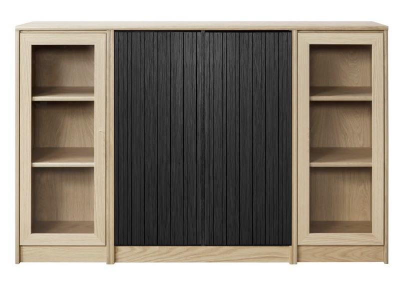 Senkissä on keskellä kaappi lasikehysovilla ja reunoilla 2 kaappia umpiovilla. Voit koota myös kokonaisuuden siten että sivulla on lasiovet ja keskelle jää umpiovet. Kokonaisuus on suunniteltu helposti räätälöitäväksi; voit valita senkin yhdellä värillä tai yhdistellä rungon, kannen ja oven eri sävyissä sekä halutessasi vaihtaa oven mallin sisustusta korostavaksi vaihtoehdoksi. Näin kaluste mukautuu elämäntilanteen ja tarpeiden muuttuessa.