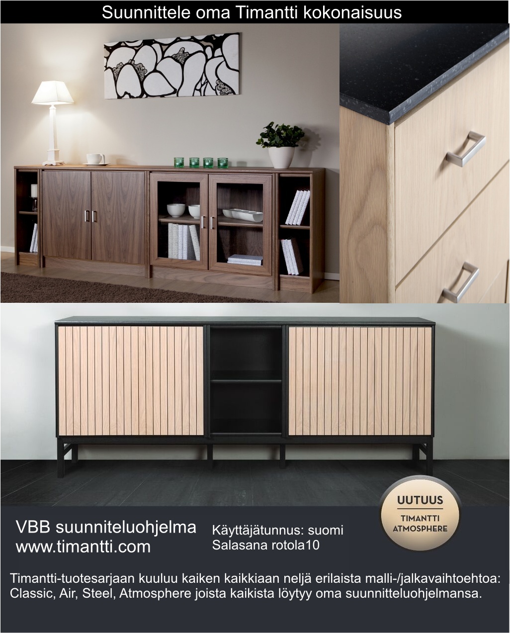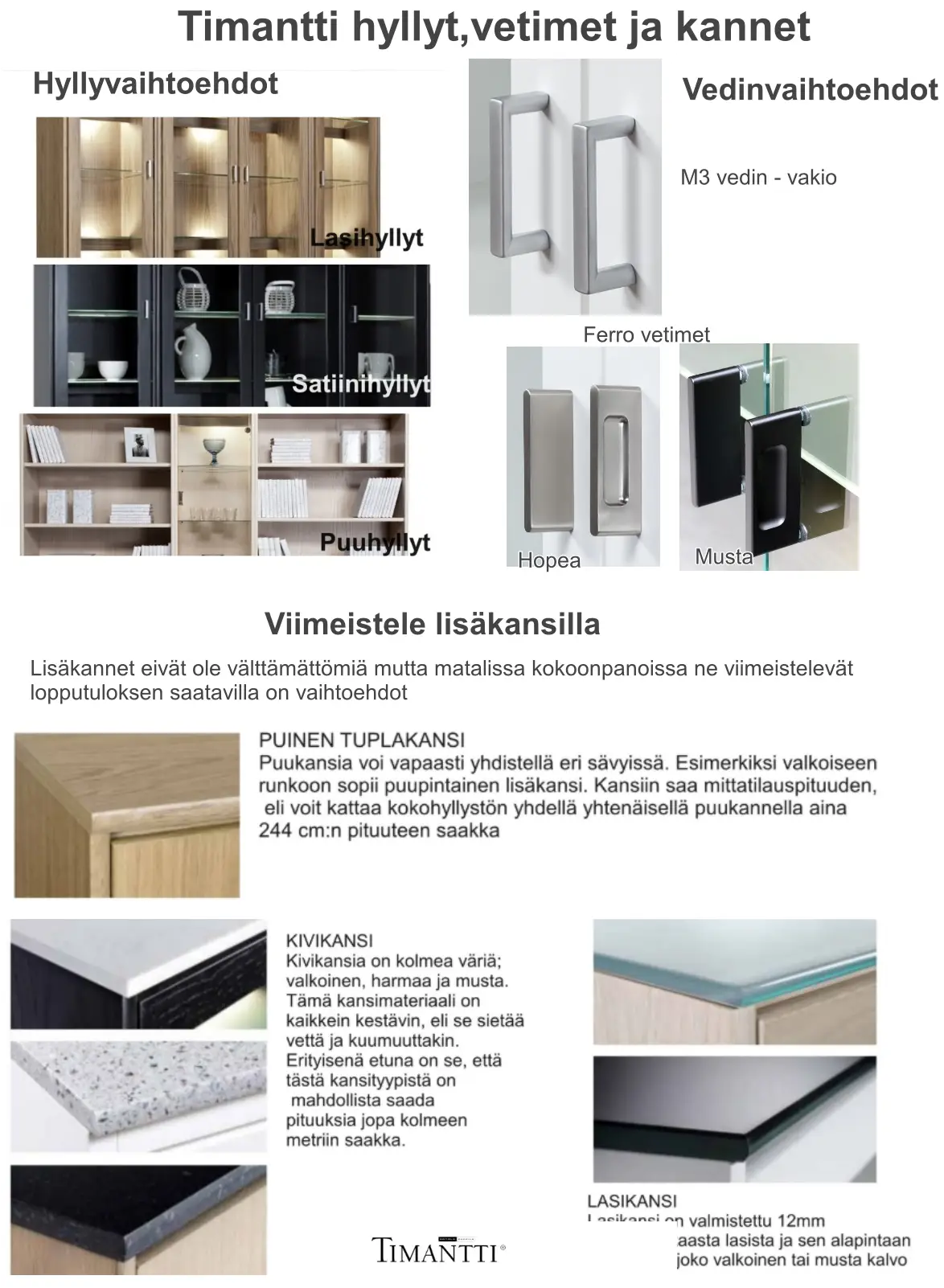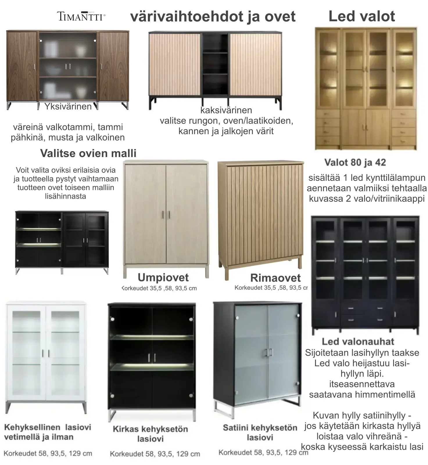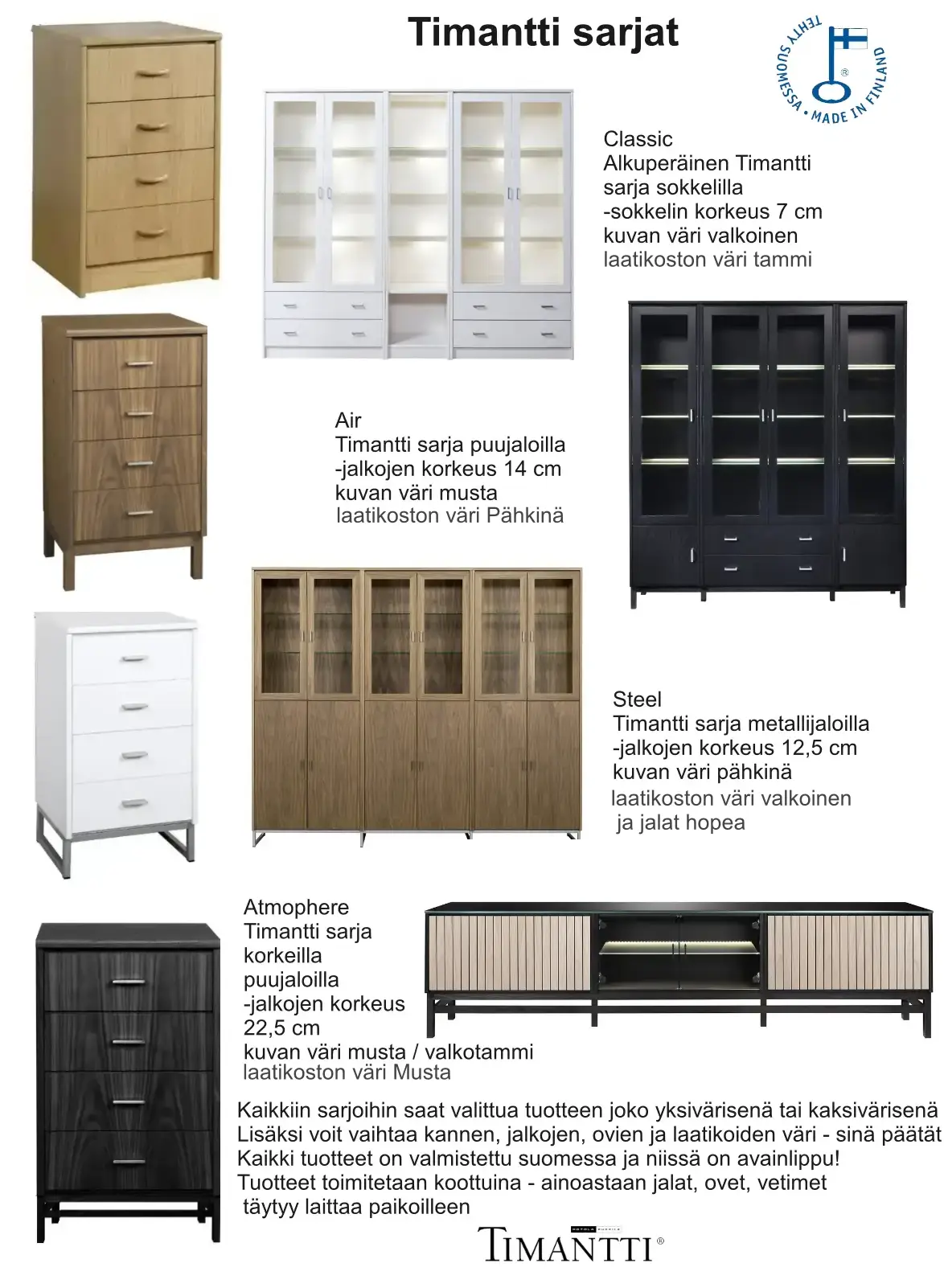Timantti senkki on osa kotimaista Timantti-kalustesarjaa ja edustaa selkeää skandinaavista muotoilua, jossa yhdistyvät harmoninen ulkonäkö ja kestävä estetiikka. Sen rauhallinen ja ajaton ilme sopii vaivattomasti olohuoneeseen, ruokailutilaan tai eteiseen sekä täydentää monenlaisia sisustustyylejä. Vitriinistä on saatavana neljä eri mallia: Timantti Classic sokkelilla, Timantti Air ja Timantti Atmosphere korkeilla puujaloilla sekä Timantti Steel metallijaloilla mustana tai hopeana, mikä mahdollistaa juuri oikean ilmeen valinnan.